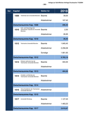 Anlage zur Schriftlichen Anfrage Drucksache 17/22694 - 202 - Epl. Kapitel Stellen für 2018 1509 Tierkliniken der Universität München Beamte 39,00 Arbeitnehmer 167,42 Zwischensumme Kap. 1509 206,42 Lehr- und Versuchsgut der 1510 tierärztlichen Fakultät der Universität Beamte 2,50 München Arbeitnehmer 26,95 Zwischensumme Kap. 1510 29,45 1512 Technische Universität München Beamte 1.845,45 Arbeitnehmer 2.256,08 Sonstige 1.661,65 Zwischensumme Kap. 1512 5.763,18 Klinikum rechts der Isar der 1513 Technischen Universität München Beamte 404,00 Arbeitnehmer Zwischensumme Kap. 1513 404,00 Anstalten und Betriebe der 1514 Technischen Universität München Beamte Arbeitnehmer Zwischensumme Kap. 1514 Versuchsstationen der Technischen 1515 Universität München Arbeitnehmer Zwischensumme Kap. 1515 1517 Universität Würzburg Beamte 1.127,45 Arbeitnehmer 1.483,22 Zwischensumme Kap. 1517 2.610,67