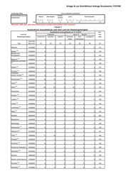 Anlage 5c zur Schriftlichen Anfrage Drucksache 17/23788 Zuständige Stelle Vom Landesamt auszufüllen Handwerkskammer für Ausbild.- Satzart Berichtsjahr Land Kammerbezirk Unterfranken bereich I I I I I I I I I I I I I I I I I I Unterfranken SSt. 1 2 3 4 5 6 7 8 13 Tabelle 2 Ausländische Auszubildende nach dem Land der Staatsangehörigkeit Ausländische Auszubildende am 31.12.2012 Kon- Land der insgesamt davon in . . . Berufen troll- Staatsangehörigkeit zusammen männlich weiblich handwerk- kauf- sonstigen1) ziffer lichen männischen Ordn.feld 4 5 6 7 8 Text SSt.14-21 01 02 03 04 05 06 07 Sonstige ** 09000000 60 39 21 45 8 7 090 Albanien 12100000 6 5 1 5 1 0 121 Bosnien und Herzegowina 12200000 5 3 2 3 1 1 122 Belgien EU) 12400000 1 0 1 1 0 0 124 Bulgarien EU) 12500000 0 0 0 0 0 0 125 Dänemark und Faröer EU) 12600000 1 1 0 1 0 0 126 Estland EU) 12700000 0 0 0 0 0 0 127 Finnland EU) 12800000 1 0 1 0 1 0 128 Frankreich, einschl. Korsika EU) 12900000 2 1 1 2 0 0 129 Kroatien 13000000 5 4 1 4 1 0 130 Slowenien EU) 13100000 0 0 0 0 0 0 131 Griechenland EU) 13400000 14 11 3 12 1 1 134 Irland EU) 13500000 0 0 0 0 0 0 135 Italien EU) 13700000 32 23 9 27 4 1 137 Lettland EU) 13900000 2 0 2 0 0 2 139 Montenegro 14000000 0 0 0 0 0 0 140 Litauen EU) 14200000 3 2 1 2 1 0 142 Luxemburg EU) 14300000 0 0 0 0 0 0 143 Mazedonien 14400000 0 0 0 0 0 0 144 Malta EU) 14500000 0 0 0 0 0 0 145 Niederlande EU) 14800000 1 1 0 1 0 0 148 Österreich EU) 15100000 1 1 0 1 0 0 151 Polen EU) 15200000 15 10 5 11 2 2 152 Portugal EU) 15300000 5 2 3 2 3 0 153 Rumänien EU) 15400000 6 3 3 3 3 0 154 Slowakei EU) 15500000 0 0 0 0 0 0 155 Schweden EU) 15700000 0 0 0 0 0 0 157 Schweiz 15800000 0 0 0 0 0 0 158 Russische Förderation 16000000 11 9 2 10 1 0 160 Spanien EU) 16100000 1 0 1 1 0 0 161 Türkei 16300000 193 132 61 157 23 13 163 Tschechische Republik EU) 16400000 3 1 2 1 1 1 164 Ungarn EU) 16500000 4 4 0 4 0 0 165 Ukraine 16600000 1 1 0 1 0 0 166 Vereinigtes Königreich * EU) 16800000 0 0 0 0 0 0 168 Weißrussland (Belarus) 16900000 1 0 1 1 0 0 169 Serbien 17000000 11 6 5 7 2 2 170 Zypern EU) 18100000 0 0 0 0 0 0 181 Marokko 25200000 2 1 1 2 0 0 252 Vereinigte Staaten (von Amerika) 36800000 4 2 2 3 1 0 368 Kasachstan 44400000 8 3 5 6 2 0 444 ohne Angabe *** 99900000 6 5 1 5 1 0 999 998 997 Insgesamt 90000000 405 270 135 318 57 30 900 1) Einschließlich der Ausbildungsberufe nach §§ 41,42 Handwerksordnung. * Großbritannien und Nordirland ** Sonstige beinhaltet weitere hier nicht aufgeführte Staatsangehörigkeiten *** ohne Angabe beinhaltet diejenigen Auszubildenden deren Staatsangehörigkeit nicht bekannt ist (Schlüssel 998)und staatenlose (Schlüssel 997) **** Umbenennung Jugoslawien (Serbien u. Montenegro) ab 1.01.2004 in Serbien und Montenegro mit Schlüssel 132 statt 138 alt Bitte Abgleich mit Tabelle 2a-2! (Gesamtzahl, nach Nationalität)