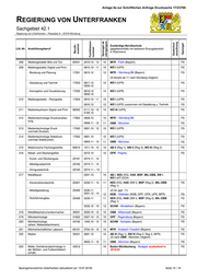 Anlage 8a zur Schriftlichen Anfrage Drucksache 17/23788 REGIERUNG VON UNTERFRANKEN Sachgebiet 42.1 Regierung von Unterfranken – Peterplatz 9 – 97070 Würzburg Fachklassen- Sprengel ab Gastschul- Sprengel Berufs- Zuständige Berufsschule Lfd.-Nr. Ausbildungsberuf (gegebenenfalls mit weiterem Einzugsbereich nummer Jahrgangsst. anordnung nummer in Klammern) 208 Mediengestalter Bild und Ton 83541 2070.10 - 12 10 MFR - Fürth (Bayern) FS 209 Mediengestalter Digital und Print 0810.10 - 11 10 WÜ I (UFR) FS - Beratung und Planung 17201 0815.12 12 MFR – Nürnberg B6 (Bayern) FS (G bereits ab 11 nach Nürnberg möglich) - Gestaltung und Technik 17203 0817.12 12 WÜ I (UFR) FS 0830.12 - Konzeption und Visualisierung 17202 0819.12 12 WÜ I (UFR) FS 0830.12 210 Mediengestalter - Flexografie 17204 0810.10 - 11 10 WÜ I (UFR) FS 0810.12 12 WÜ I (UFR) zusammen mit Gestaltung u. Technik FS 211 Medienkaufmann Digital und Print 68302 0111.10 - 12 10 WÜ Kl (UFR) FS 0165.10 212 M Medientechnologe Druckverarbei- 17802 0808.10 10 MFR – Nürnberg B6 FS tung 0808.11 - 12 11 OBB - München FS 213 Medientechnologe Druck 17500 0801.10 - 12 10 WÜ I (UFR) FS (vormals Drucker) 214 Medientechnologe Siebdruck 17502 0801.10 10 WÜ I (UFR) FS (vormals Siebdrucker) 0805.11 - 12 11 OBB - München FS 215 Medizinische Fachangestellte 85610 1011.10 - 12 10 AB II (Reg 1), SW II (Reg 3), WÜ Kl (Reg 2) FS 216 Metall- und Glockengießer 0272.10 10 OFR - Pegnitz FS - Kunst- und Glockenguss 20161 0274.11 - 12 - Metallgusstechnik 20162 0274.11 - 12 - Zinngusstechnik 20163 0274.11 – 12 217 Metallbauer 0201.10 10 AB I, NES (KG), HAS, MSP, MIL-OBB, SW I, WÜ I (KT-OCH) - Konstruktionstechnik 25401 0230.11 - 13 11 NES (KG), HAS (SW I), MSP (Reg 2), MIL-OBB FS (Reg 1) - Metallgestaltung 25402 0230.11 (G für Jgst. 11) 0231.12 - 13 12 NDB - Vilshofen (NDB, OPF, OFR, UFR, MFR) FS - Nutzfahrzeugbau 25406 0230.11 11 NES (KG), HAS (SW I), MSP (Reg 2), MIL-OBB FS (Reg 1) 0232.12 - 13 12 SCHW - Mindelheim (Bayern) FS 218 Metallblasinstrumentenmacher 30531 2032.10 - 12 10 OBB - Mittenwald (Bayern) FS 219 Mikrotechnologe 31622 0327.10 - 12 10 OPF - Regensburg (Bayern) FS 220 Milchtechnologe 43102 1345.10 - 12 10 SCHW - Kempten (Bayern) FS (ehem. Molkereifachmann) 221 Milchwirtschaftlicher Laborant 63151 0704.10 - 12 10 MFR - Ansbach-Triesdorf (Bayern) FS 222 Modist 35431 0601.10 10 AB III (Reg 1), SW III (Reg 2, Reg 3, MFR) FS (G nach OBB - München möglich) 0603.11 - 12 11 OBB - München (Bayern) FS 223 Müller (Verfahrenstechnologe in 43512 10 Baden-Württemberg - Stuttgart auslaufend in FS der Mühlen- und Futtermittelwirt- 2019/20 schaft) Sprengelverzeichnis Unterfranken (aktualisiert am 13.07.2018) Seite 12 / 19