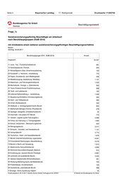 Seite 6 Bayerischer Landtag · 17. Wahlperiode Drucksache 17/200758 Beschäftigungsstatistik Frage_2c Sozialverischerungspflichtig Beschäftigte am Arbeitsort nach Berufshauptgruppen (KldB 2010) mit mindestens einem zusätzlichen geringfügigen Beschäftigungsverhältnis Bayern Stichtag: 30.06.2017 Berufshauptgruppe 2010 (KldB 2010) Anzahl Insgesamt 567.164 11 Land-, Tier-, Forstwirtschaftsberufe 3.382 12 Gartenbauberufe, Floristik 3.493 21 Rohstoffgewinn,Glas-,Keramikverarbeitung 2.375 22 Kunststoff- u. Holzherst.,-verarbeitung 10.302 23 Papier-,Druckberufe, tech.Mediengestalt. 5.201 24 Metallerzeugung,-bearbeitung, Metallbau 19.926 25 Maschinen- und Fahrzeugtechnikberufe 28.204 26 Mechatronik-, Energie- u. Elektroberufe 12.995 27 Techn.Entwickl.Konstr.Produktionssteuer. 12.308 28 Textil- und Lederberufe 3.372 29 Lebensmittelherstellung u. -verarbeitung 20.199 31 Bauplanung,Architektur,Vermessungsberufe 2.202 32 Hoch- und Tiefbauberufe 6.626 33 (Innen-)Ausbauberufe 4.826 34 Gebäude- u. versorgungstechnische Berufe 13.660 41 Mathematik-Biologie-Chemie-,Physikberufe 4.570 42 Geologie-,Geografie-,Umweltschutzberufe 529 43 Informatik- und andere IKT-Berufe 6.269 51 Verkehr, Logistik (außer Fahrzeugführ.) 40.207 52 Führer von Fahrzeug- u. Transportgeräten 19.473 53 Schutz-,Sicherheits-, Überwachungsberufe 5.932 54 Reinigungsberufe 40.221 61 Einkaufs-, Vertriebs- und Handelsberufe 12.300 62 Verkaufsberufe 42.926 63 Tourismus-, Hotel- und Gaststättenberufe 22.749 71 Berufe Unternehmensführung,-organisation 72.474 72 Finanzdienstl.Rechnungsw.,Steuerberatung 24.303 73 Berufe in Recht und Verwaltung 14.702 81 Medizinische Gesundheitsberufe 49.140 82 Nichtmed.Gesundheit,Körperpfl.,Medizint. 14.802 83 Erziehung,soz.,hauswirt.Berufe,Theologie 29.608 84 Lehrende und ausbildende Berufe 7.611 91 Geistes-Gesellschafts-Wirtschaftswissen. 957 92 Werbung,Marketing,kaufm,red.Medienberufe 6.457 93 Produktdesign, Kunsthandwerk 1.174 94 Darstellende, unterhaltende Berufe 1.407 X Sonstige / Keine Zuordnung möglich 282 Erstellungsdatum: 28.12.2017, Statistik-Service Südost, Auftragsnummer 257631 © Statistik der Bundesagentur für Arbeit