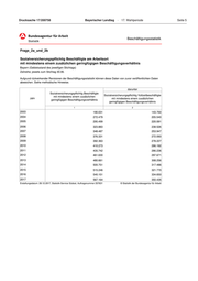 Drucksache 17/200758 Bayerischer Landtag · 17. Wahlperiode Seite 7 Beschäftigungsstatistik Frage_3 Ausschließlich geringfügig Beschäftigte am Arbeitsort mit mindestens einem weiteren geringfügigen Beschäftigungsverhältnis Bayern (Gebietsstand des jeweiligen Stichtags) Zeitreihe; jeweils zum Stichtag 30.06. Aufgrund rückwirkender Revisionen der Beschäftigungsstatistik können diese Daten von zuvor veröffentlichten Daten abweichen. Siehe methodische Hinweise. Jahr Anzahl 2003 25.543 2004 32.197 2005 35.969 2006 38.280 2007 40.515 2008 41.500 2009 43.829 2010 45.658 2011 46.857 2012 47.226 2013 48.512 2014 51.577 2015 50.750 2016 50.330 2017 49.624 Erstellungsdatum: 28.12.2017, Statistik-Service Südos © Statistik der Bundesagentur für Arbeit