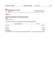 Drucksache 17/200758 Bayerischer Landtag · 17. Wahlperiode Seite 9 Beschäftigungsstatistik Frage_4c Mehrfachbeschäftigte nach Staatsangehörigkeit Bayern Stichtag: 30.06.2017 Beschäftigte am Arbeitsort mit mindestens einem weiteren Beschäftigungsverhältnis Staatsangehörigkeit Anzahl Insgesamt 659.991 Deutsche 561.155 Ausländer 98.644 Keine Angabe 192 Erstellungsdatum: 28.12.2017, Statistik-Service Südost, Auftragsnummer 257631 © Statistik der Bundesagentur für Arbeit