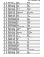 Anlagen zur Schriftlichen Anfrage 17/18067 26 M Dublin III - Rückübernahme Äthiopien Belgien 1 26 M Dublin III - Rückübernahme Eritrea Schweiz 1 26 M Dublin III - Rückübernahme Irak Ungarn 1 26 M Dublin III - Rückübernahme Marokko Österreich 1 26 M Dublin III - Rückübernahme Nigeria Italien 3 26 M Dublin III - Rückübernahme Somalia Italien 2 26 M Dublin III - Rückübernahme Uganda Spanien 1 26 M Dublin III - Rückübernahme Weißrussland (Belarus) Polen 1 26 M Illegaler Aufenthalt Afghanistan Ungarn 1 26 M Illegaler Aufenthalt Albanien Albanien 1 26 M Illegaler Aufenthalt Togo Italien 1 27 M Abgelehnter Asylantrag Afghanistan Afghanistan 3 27 M Abgelehnter Asylantrag Georgien Georgien 2 27 M Abgelehnter Asylantrag Kosovo (Republik) Kosovo (Republik) 3 27 M Abgelehnter Asylantrag Pakistan Pakistan 1 27 M Abgelehnter Asylantrag Syrien, Arabische Republik Bulgarien 1 27 M Ausgewiesener Straftäter Georgien Georgien 1 27 M Ausgewiesener Straftäter Griechenland Griechenland 1 27 M Ausgewiesener Straftäter Litauen Litauen 1 27 M Ausgewiesener Straftäter Rumänien Rumänien 2 27 M Ausgewiesener Straftäter Tunesien Italien 1 27 M Ausgewiesener Straftäter Türkei Türkei 1 27 M Ausreisepflicht kraft GesetzesAlbanien Albanien 1 27 M Dublin III - Rückübernahme Aserbaidschan Polen 1 27 M Dublin III - Rückübernahme Äthiopien Italien 3 27 M Dublin III - Rückübernahme Cote d'Ivoire (Elfenbeinküste) Italien 1 27 M Dublin III - Rückübernahme Eritrea Italien 2 27 M Dublin III - Rückübernahme Irak Finnland 3 27 M Dublin III - Rückübernahme Irak Kroatien 1 27 M Dublin III - Rückübernahme Mali Italien 2 27 M Dublin III - Rückübernahme Nigeria Italien 3 27 M Dublin III - Rückübernahme Pakistan Italien 1 27 M Dublin III - Rückübernahme Russland Polen 1 27 M Dublin III - Rückübernahme Senegal Italien 1 27 M Dublin III - Rückübernahme Somalia Italien 1 27 M Dublin III - Rückübernahme Somalia Schweden 1 27 M Dublin III - Rückübernahme Ukraine Tschechische Republik 1 27 M Illegaler Aufenthalt Bosnien-Herzegowina Bosnien-Herzegowina 1 27 M Illegaler Aufenthalt Georgien Georgien 1 27 M Illegaler Aufenthalt Kosovo (Republik) Kosovo (Republik) 1 28 M Abgelehnter Asylantrag Bosnien-Herzegowina Bosnien-Herzegowina 1 28 M Abgelehnter Asylantrag Georgien Georgien 1 28 M Abgelehnter Asylantrag Kosovo (Republik) Kosovo (Republik) 4 28 M Abgelehnter Asylantrag Mazedonien Mazedonien 1 28 M Abgelehnter Asylantrag Senegal Senegal 1 28 M Abgelehnter Asylantrag Ukraine Ukraine 1 28 M Ausgewiesener Straftäter Georgien Georgien 2 28 M Ausgewiesener Straftäter Italien Italien 2 28 M Ausgewiesener Straftäter Kosovo (Republik) Kosovo (Republik) 1 28 M Ausgewiesener Straftäter Marokko Marokko 1 28 M Ausgewiesener Straftäter Polen Polen 1 28 M Ausgewiesener Straftäter Rumänien Rumänien 5 28 M Ausgewiesener Straftäter Türkei Türkei 1 28 M Ausreisepflicht kraft GesetzesLettland Lettland 1 28 M Ausreisepflicht kraft GesetzesPakistan Italien 1 28 M Ausreisepflicht kraft GesetzesRumänien Rumänien 1 28 M Ausreisepflicht kraft GesetzesSlowenien Slowenien 1 28 M Dublin III - Rückübernahme Ägypten Ungarn 1 28 M Dublin III - Rückübernahme Aserbaidschan Tschechische Republik 1 28 M Dublin III - Rückübernahme Eritrea Italien 1 28 M Dublin III - Rückübernahme Irak Finnland 3 28 M Dublin III - Rückübernahme Iran Italien 1 28 M Dublin III - Rückübernahme Marokko Italien 1 28 M Dublin III - Rückübernahme Nigeria Italien 2 28 M Dublin III - Rückübernahme Pakistan Italien 1 28 M Dublin III - Rückübernahme Senegal Italien 2 28 M Dublin III - Rückübernahme Somalia Schweden 1