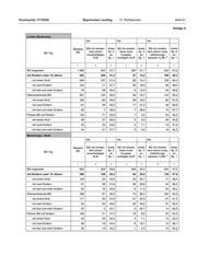 Seite 62 Bayerischer Landtag · 17. Wahlperiode Drucksache 17/16529 - 49 - Anlage 4 Neu-Ulm dar. dar. dar. Bestand BG mit mindes- Anteil BG mit arbeits- Anteil BG mit mindes- Anteil BG tens einem Sp. 2 losen erzie- Sp. 4 tens einem Lang- Sp. 6 BG Typ erwerbstätigen an hungsbe- an zeitleistungs- an 1 2) ELB Sp. 1 rechtigten ELB Sp. 1 bezieher (LZB) Sp. 1 1 2 3 4 5 6 7 BG insgesamt 2.830 871 30,8 747 26,4 1.546 54,6 mit Kindern unter 18 Jahren 1.007 480 47,7 177 17,6 603 59,9 mit einem Kind 515 234 45,4 98 19,0 301 58,4 mit zwei Kindern 305 166 54,4 56 18,4 192 63,0 mit drei und mehr Kindern 187 80 42,8 23 12,3 110 58,8 Alleinerziehende-BG 611 257 42,1 156 25,5 425 69,6 mit einem Kind 361 146 40,4 88 24,4 235 65,1 mit zwei Kindern 187 89 47,6 50 26,7 140 74,9 mit drei und mehr Kindern 63 22 34,9 18 28,6 50 79,4 Partner-BG mit Kindern 393 223 56,7 21 5,3 178 45,3 mit einem Kind 151 88 58,3 10 6,6 66 43,7 mit zwei Kindern 118 77 65,3 6 5,1 52 44,1 mit drei und mehr Kindern 124 58 46,8 5 4,0 60 48,4 Oberallgäu dar. dar. dar. Bestand BG mit mindes- Anteil BG mit arbeits- Anteil BG mit mindes- Anteil BG tens einem Sp. 2 losen erzie- Sp. 4 tens einem Lang- Sp. 6 BG Typ erwerbstätigen an hungsbe- an zeitleistungs- an 1 2) ELB Sp. 1 rechtigten ELB Sp. 1 bezieher (LZB) Sp. 1 1 2 3 4 5 6 7 BG insgesamt 1.727 611 35,4 687 39,8 851 49,3 mit Kindern unter 18 Jahren 545 288 52,8 143 26,2 282 51,7 mit einem Kind 302 168 55,6 84 27,8 162 53,6 mit zwei Kindern 165 93 56,4 42 25,5 86 52,1 mit drei und mehr Kindern 78 27 34,6 17 21,8 34 43,6 Alleinerziehende-BG 374 182 48,7 127 34,0 215 57,5 mit einem Kind 235 120 51,1 79 33,6 140 59,6 mit zwei Kindern 101 50 49,5 37 36,6 59 58,4 mit drei und mehr Kindern 38 12 31,6 11 28,9 16 42,1 Partner-BG mit Kindern 169 106 62,7 16 9,5 67 39,6 mit einem Kind 66 48 72,7 5 7,6 22 33,3 mit zwei Kindern 63 43 68,3 5 7,9 27 42,9 mit drei und mehr Kindern 40 15 37,5 6 15,0 18 45,0