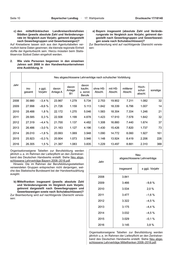 Seite 8 Bayerischer Landtag · 17. Wahlperiode Drucksache 17/18140 Eintragungen ins Verzeichnis Eintragungen in die Handwerksrolle der zulassungsfreien Handwerke (Anlage A) (Anlage B1) Jahr Jahr Anzahl ± ggü. Vorjahr Anzahl ± ggü. Vorjahr 2008 5.881 2008 6.484 2009 5.904 0,4 % 2009 7.547 16,4 % 2010 5.790 –1,9 % 2010 8.228 9,0 % 2011 5.220 –9,8 % 2011 8.458 2,8 % 2012 4.914 –5,9 % 2012 8.624 2,0 % 2013 5.201 5,8 % 2013 8.799 2,0 % 2014 5.243 0,8 % 2014 8.192 –6,9 % 2015 4.993 –4,8 % 2015 7.848 –4,2 % 2016 4.950 –0,9 % 2016 7.806 –0,5 % Zu den Neugründungen im Handwerk gibt es keine amt- Hierzu liefert die amtliche Handwerkszählung des Sta- lichen Daten. In den Handwerkskammern werden jedoch tistischen Bundesamts teilweisen Einblick für die Jahre Zugangsstatistiken geführt, d. h., es gibt Angaben zur Zahl 2008–2014. Angaben zu Gewerbezweigen fehlen gänzlich, der pro Jahr angemeldeten Betriebe (nicht Unternehmen!). für die Anlagen A und B1 werden nur Gewerbegruppen aus- Siehe Eintragungsstatistik Bayern 2008–2016.pdf. gewiesen. Siehe HWZ 2008–2014 Bayern Beschäftigten- größenklassen.pdf. b) Mittelfranken insgesamt (jeweils absolute Zahl und Veränderungsrate im Vergleich zum Vorjahr, b) Mittelfranken gesamt (jeweils absolute Anzahl der getrennt dargestellt nach Gewerbegruppen und Betriebe und Veränderungsrate im Vergleich zum Gewerbezweigen)? Vorjahr, getrennt dargestellt nach Gewerbegrup- Siehe Existenzgründungen Mfr 2008–2016.pdf. pen und Gewerbezweigen)? Hierzu liefert die amtliche Handwerkszählung des Sta- c) den mittelfränkischen Landkreisen/kreisfreien tistischen Bundesamts teilweisen Einblick für die Jahre Städten (jeweils absolute Zahl und Veränderungs- 2008–2014. Auf Bezirksebene fehlen Angaben zu Anlage rate im Vergleich zum Vorjahr, getrennt dargestellt B1 gänzlich, für die Anlage A werden nur Gewerbegruppen nach Gewerbegruppen und Gewerbezweigen)? ausgewiesen. Siehe HWZ 2008–2014 Bayern Beschäf- Siehe Existenzgründungen nach Landkreis Mfr 2008–2016. tigtengrößenklassen.pdf. pdf. c) den mittelfränkischen Landkreisen/kreisfreien 7. Wie groß war die Anzahl an Handwerksunterneh- Städten (jeweils absolute Zahl und Veränderungs- men gemäß ihrer Betriebsgrößenstruktur nach rate im Vergleich zum Vorjahr, getrennt dargestellt Beschäftigtenzahlen (Kleinst-, Klein-, Mittel- und nach Gewerbegruppen und Gewerbezweigen)? Großunternehmen) in den einzelnen Jahren seit Hierzu sind keine Angaben verfügbar. 2008, in a) Bayern gesamt (absolute Anzahl der Betriebe und Veränderungsrate im Vergleich zum Vorjahr, ge- trennt dargestellt nach Gewerbegruppen und Ge- werbezweigen)?