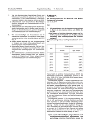 Drucksache 17/18140 Bayerischer Landtag · 17. Wahlperiode Seite 9 Teil II 1. Wie viele Ausbildungsplätze boten die Handwerks- unternehmen in den einzelnen Jahren seit 2008 an, in a) Bayern insgesamt (absolute Zahl und Verände- rungsrate im Vergleich zum Vorjahr, getrennt dar- gestellt nach Gewerbegruppen und Gewerbezwei- gen)? Übersicht Hochrechnung Ausbildungsjahr unbesetzt in % besetzt Angebot 2009 30.100 2.100 6,9 % 27.998 2010 31.000 2.500 8,2 % 28.488 2011 32.400 3.800 11,9 % 28.585 2012 31.600 4.300 13,6 % 27.319 2013 30.600 4.100 13,5 % 26.486 2014 30.700 4.700 15,2 % 26.010 2015 31.300 5.400 17,2 % 25.923 2016 31.900 5.400 17,0 % 26.500 Belastbare organisationseigene Erhebungen zu diesem b) Mittelfranken insgesamt (jeweils absolute Zahl Thema gibt es nicht. Anhaltspunkte liefern jedoch die Ar- und Veränderungsrate im Vergleich zum Vorjahr, beitsagenturen. Sie erheben unbesetzte Lehrstellen gemäß getrennt dargestellt nach Gewerbegruppen und der zuständigen Stelle (Handwerkskammer, IHK etc.). Der Gewerbezweigen)? Bayerische Handwerkstag hat auf der Basis dieser BA- Aus den Erhebungen der Arbeitsagenturen lassen sich auch Statistik (BA = Bundesamt) eine Hochrechnung zur Lehr- Daten auf Bezirksebene gewinnen. Allerdings hat der Baye- stellensituation vorgenommen, die bis 2009 zurückreicht. rische Handwerkstag (BHT) bislang keine Hochrechnung Siehe Ausbildungsstellen im bayerischen Handwerk 2016. für Mittelfranken vorgenommen. Die Originaldaten, die uns pdf. Angaben zu Gewerbezweigen und –gruppen sind nicht vom Statistikservice Südost des BA zur Verfügung gestellt verfügbar. wurden, sehen folgendermaßen aus: Bei den Arbeitsagenturen gemeldete Ausbildungsstellen im Handwerk (Mittelfranken) Jahr* Gesamt davon am 30.09. unbesetzt Anteil 2011 3.023 390 12,9 % 2012 3.329 477 14,3 % 2013 3.227 477 14,8 % 2014 3.426 557 16,3 % 2015 3.398 565 16,6 % 2016 3.407 613 18,0 % *Jeweils 01.10. bis 30.09.