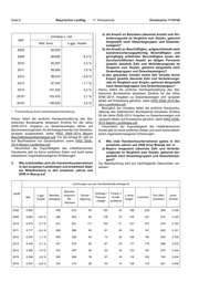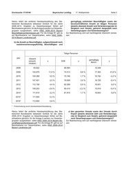 Drucksache 17/18140 Bayerischer Landtag · 17. Wahlperiode Seite 5 Hierzu liefert die amtliche Handwerkszählung des Sta- geringfügig entlohnten Beschäftigten sowie der tistischen Bundesamts teilweisen Einblick für die Jahre durchschnittlichen Anzahl an tätigen Personen 2008–2014. Angaben zu Gewerbezweigen fehlen auf (jeweils absolute Anzahl und Veränderungsrate im Bezirksebene gänzlich, für die Anlage A werden nur Gewerbe- Vergleich zum Vorjahr, getrennt dargestellt nach gruppen ausgewiesen, siehe HWZ 2008–2014 Bayern Gewerbegruppen und Gewerbezweigen)? Beschäftigtengrößenklassen.pdf. Für die Anlage B1 gibt es Zur Beantwortung wird auf nachfolgende Übersicht verwie- auf Bezirksebene nur Gesamtzahlen, siehe HWZ 2008– sen: 2014 Bayern Landkreise.pdf. b) die Anzahl an Beschäftigten, aufgeschlüsselt nach sozialversicherungspflichtig Beschäftigten und Tätige Personen Jahr Gesamt geringfügig (einschl. ± SVB ± ± Besch. Inhaber) 2008 93.822 68.594 12.249 2009 104.879 11,8 % 74.513 8,6 % 17.363 41,8 % 2010 105.389 0,5 % 75.746 1,7 % 16.792 –3,3 % 2011 107.451 2,0 % 78.008 3,0 % 16.729 –0,4 % 2012 112.158 4,4 % 82.289 5,5 % 16.831 0,6 % 2013 109.203 –2,6 % 80.410 –2,3 % 15.919 –5,4 % 2014 111.615 2,2 % 81.810 1,7 % 16.843 5,8 % 2015* 111.900 0,3 % 2016* 112.800 0,8 % * Fortschreibung durch Handwerksberichterstattung. Hierzu liefert die amtliche Handwerkszählung des Sta- c) den gesamten Umsatz sowie den Umsatz durch tistischen Bundesamts teilweisen Einblick für die Jahre Export (jeweils absolute Zahl und Veränderungs- 2008–2014. Angaben zu Gewerbezweigen fehlen auf Be- rate im Vergleich zum Vorjahr, getrennt dargestellt zirksebene gänzlich, für die Anlage A werden nur Gewerbe- nach Gewerbegruppen und Gewerbezweigen)? gruppen ausgewiesen, siehe HWZ 2008–2014 Bayern Be- Zur Beantwortung wird auf nachfolgende Übersicht verwie- schäftigtengrößenklassen.pdf. Für die Anlage B1 gibt es auf sen: Bezirksebene nur Gesamtzahlen, siehe HWZ 2008–2014 Bayern Landkreise.pdf.