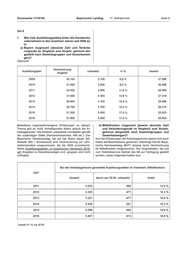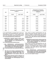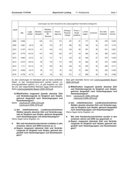 Drucksache 17/18140 Bayerischer Landtag · 17. Wahlperiode Seite 3 7. Wie viele Betriebsinhaber, Beschäftigte (Teilzeit- und Vollzeit) und Auszubildende gab es in den Handwerks- Antwort unternehmen in den mittelfränkischen Landkreisen/ des Staatsministeriums für Wirtschaft und Medien, kreisfreien Städten in den einzelnen Jahren seit 2008, Energie und Technologie a) aufgeschlüsselt nach Geschlecht der Beschäftigten vom 01.09.2017 (getrennt dargestellt nach Gewerbegruppen und Ge- werbezweigen)? Teil I b) aufgeschlüsselt nach Nationalität (jeweils die fünf häu- figsten Nationalitäten der EU-Bürger sowie Nicht-EU- 1. Wie entwickelten sich die Handwerksunternehmen Bürger mit Aufenthaltserlaubnis, getrennt dargestellt in Bayern in den einzelnen Jahren seit 2008 in Be- nach Gewerbegruppen und Gewerbezweigen)? zug auf a) die Anzahl an Betrieben (absolute Anzahl und Ver- 8. Wie viele Beschäftigte und Auszubildende sind im änderungsrate im Vergleich zum Vorjahr, getrennt Rahmen der sogenannten 3+2-Regelung in den Hand- dargestellt nach Gewerbegruppen und Gewerbe- werksunternehmen in den einzelnen Jahren seit 2016 zweigen)? tätig, in Zur Beantwortung wird auf nachfolgende Übersicht verwie- a) Bayern gesamt (absolute Zahl und Veränderungsrate sen: im Vergleich zum Vorjahr, bitte aufgeschlüsselt nach Gewerbegruppen und Gewerbezweigen)? b) Mittelfranken gesamt (jeweils absolute Zahl und Ver- Unternehmen änderungsrate im Vergleich zum Vorjahr, bitte aufge- Jahr schlüsselt nach Gewerbegruppen und Gewerbezwei- gen)? Anzahl ± ggü. Vorjahr c) den mittelfränkischen Landkreisen/kreisfreien Städten Mittelfrankens (jeweils absolute Zahl und Verände- 2008 103.857 rungsrate im Vergleich zum Vorjahr, aufgeschlüsselt 2009 103.699 –0,2 % nach Gewerbegruppen und Gewerbezweigen)? 2010 104.092 0,4 % 2011 103.221 –0,8 % 2012 105.915 2,6 % 2013 105.274 –0,6 % 2014 107.140 1,8 % Hierzu liefert die amtliche Handwerkszählung (HWZ) des Statistischen Bundesamts vollständigen Einblick für die Jahre 2008–2014. Siehe HWZ 2008–2014 Bayern Gewer- begruppen und -zweige.pdf. Grundlegender Hinweis 1: Wegen systematischer Um- stellungen sind die Ergebnisse einzelner Jahre nicht unbe- dingt miteinander vergleichbar. Beispielsweise wurden ab der zweiten Registerauswertung (2009) etliche große Un- ternehmen hinsichtlich ihrer Zugehörigkeit zum Handwerk anders bewertet, was starke Schwankungen bei Beschäf- tigung und Umsatz zur Folge hatte. Auch Sitzverlegungen großer Unternehmen in andere Bundesländer hatten deut- lich schwankende Bestandsdaten zur Folge. Genaueres ist von den Statistischen Ämtern aus Datenschutzgründen nicht zu erfahren. Grundlegender Hinweis 2: Die Handwerkszählung legt eine in sich geschlossene, stimmige Definition des Hand- werks zugrunde. Es geht um rechtlich selbständige Unter- nehmen des zulassungspflichtigen (Anlage A Handwerks- ordnung – HwO) und des zulassungsfreien (Anlage B1 HwO) Handwerks, die Beschäftigte haben und/oder Umsät- ze von mehr als 17.500 Euro pro Jahr. Generell nicht erfasst werden Kleinstunternehmen aus A und B1 sowie das hand- werksähnliche Gewerbe in Gänze (Anlage B2 HwO). b) die Anzahl an Beschäftigten, aufgeschlüsselt nach sozialversicherungspflichtig Beschäftigten und geringfügig entlohnten Beschäftigten sowie der