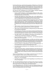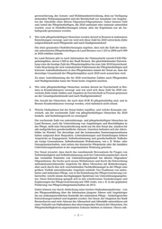 BREMISCHE BÜRGERSCHAFT Drucksache 18 / 423 Landtag (zu Drs. 18/339) 18. Wahlperiode 22. 05. 12 Mitteilung des Senats vom 22. Mai 2012 Zukunft der Pflege im Land Bremen Die Fraktion der CDU hat unter Drucksache 18/339 eine Große Anfrage zu obigem Thema an den Senat gerichtet. Der Senat beantwortet die vorgenannte Große Anfrage wie folgt: 1. Wie viele pflegebedürftige Menschen leben derzeit im Land Bremen, und wie wird sich diese Zahl bis 2020 entwickeln (bitte aufgeschlüsselt nach Pflegestufe und Stadtgemeinden)? Die Pflegestatistik wird von den statistischen Ämtern des Bundes und der Län- der zweijährlich durchgeführt. Die Pflegestatistik 2009 wurde vom Senat 2011 veröffentlicht. Daraus geht hervor, wie viele pflegebedürftige Menschen mit Leis- tungen nach dem SGB XI zum 31. Dezember 2009 im Land Bremen lebten, auf- geschlüsselt nach Pflegestufe und Stadtgemeinden (siehe Anlage, Statistisches Landesamt, Statistisches Jahrbuch 2011, Seite 188). Es kann nicht angegeben werden, wie viele pflegebedürftige Menschen aktuell im Land Bremen leben. Daten aus der Pflegestatistik 2011 können erst im Lauf des Jahres 2012 erwartet werden. Modellrechnungen der Senatorin für Soziales, Kinder, Jugend und Frauen be- ruhen auf der Grundlage der Bevölkerungsvorausschätzung des Statistischen Landesamtes von 2010 und der vereinfachenden Annahme, dass sich die Zahl der Pflegebedürftigen ähnlich der Zahl der über 80-Jährigen in Bremen ent- wickeln wird. Mögliche Veränderungen der Pflegequote, d. h. des Anteils der Pflegebedürftigen an einer Altersgruppe, können damit nicht erfasst werden. Nach den Modellrechnungen würde sich die Zahl der Pflegebedürftigen im Land Bremen von 21 340 in 2009 auf gerundet 28 000 in 2020 erhöhen. Zu einer Aufschlüsselung der Zahlen nach Pflegestufen und Stadtgemeinden kann der Senat in der für die Beantwortung dieser Anfrage zur Verfügung stehenden Zeit und mit den zur Verfügung stehende Personalressourcen keine Angaben ma- chen. 2. Wie viele pflegebedürftige Menschen werden derzeit in Bremen in der ambu- lanten Pflege versorgt, und wie wird sich diese Zahl bis 2020 entwickeln (bitte aufgeschlüsselt nach Pflegestufe und nach Stadtgemeinden)? Die oben genannten Modellrechnungen ergeben, dass sich die Zahl der ambu- lant unterstützten Pflegebedürftigen im Land Bremen von 16 085 in 2009 auf 21 100 in 2020 erhöhen könnte. Hierbei wird jedoch eine konstante Heimquote unterstellt, d. h. des Anteils der Pflegebedürftigen, die in Heimen gepflegt werden. Diese Annahme kann die reale Entwicklung aber nur bedingt abbilden. Zwischen 2007 und 2009 ist z. B. trotz eines Anstiegs der Gesamtzahl der Pflegebedürftigen die Zahl der Perso- nen in stationärer Pflege in Bremen gesunken, die Heimquote daher gefallen. Eine Vielzahl von Faktoren wirkt auf die Heimquote ein. Ihre Entwicklung ist in jedem Fall abhängig von den Präferenzen der Pflegebedürftigen. Sie ist mut- maßlich abhängig von den zur Verfügung stehenden Unterstützungsangeboten für den Verbleib im angestammten Zuhause, den jeweiligen Leistungen der Pfle- — 1 —