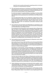 Jahr 2012 wird von LinDe ein Konzept für Angehörigenarbeit von Demenz- erkrankten im Akutkrankenhaus erarbeitet. 12. Wie viele Menschen sind derzeit im Land Bremen in der Pflege beschäftigt (bitte aufgeschlüsselt nach Geschlecht, nach professionellen Berufsgruppen und nach Pflegehilfskräften, ambulanten Pflegediensten, stationären Einrichtungen, Hos- pizen und den einzelnen Kliniken in den Stadtgemeinden)? Es besteht kein Register für die Beschäftigten in der Pflege. Der Senat schätzt, dass insgesamt derzeit ca. 18 000 Personen (einschließlich des entsprechend tä- tigen Personals in den Krankenhäusern) im Land Bremen in der Pflege beschäf- tigt sind. Nach der Pflegestatistik 2009 waren im Land Bremen 3 248 Personen in ambu- lanten Einrichtungen der Pflege nach dem SGB XI beschäftigt, darunter 2 429 Frauen. In stationären Pflegeinrichtungen nach dem SGB XI waren 5 163 Per- sonen beschäftigt, darunter 4 331 Frauen. Weitere Angaben lassen sich dem Statistischen Jahrbuch 2011 des Statistischen Landesamtes entnehmen (siehe Anlage, Seite 187). 13. Wie beurteilt der Senat den Bedarf nach Pflegekräften im Land Bremen in den nächsten zehn Jahren (bitte aufgeschlüsselt nach professionellen Berufsgruppen und Pflegehilfskräften und Stadtgemeinden)? Die demografische Entwicklung führt zu einer steigenden Zahl von Pflegebedürf- tigen und damit zu einer steigenden Zahl der benötigten Pflegekräfte. In Ab- stimmung mit dem Senat hat die Arbeitnehmerkammer beim Institut für Arbeit und Wirtschaft (iaw) für 2012 eine Untersuchung in Auftrag gegeben, die die Si- tuation der Pflegekräfte und des Fachkräftemangels sowie die Personal- und Qualifizierungsbedarfe im Land Bremen analysieren und Verbesserungsmög- lichkeiten aufzeigen soll. Der Senat erwartet daraus wertvolle Hinweise. Eine genaue Prognose zum Bedarf nach Pflegekräften im Land Bremen in den nächs- ten zehn Jahren, aufgeschlüsselt nach professionellen Berufsgruppen und Pflege- hilfskräften und Stadtgemeinden, kann allerdings nicht erwartet werden. 14. Wie beurteilt der Senat die Arbeitsbedingungen der Pflegenden und die Attrak- tivität der Pflegeberufe in Bremen? Nach Auffassung des Senats erfährt die Pflege noch nicht die gesellschaftliche Wertschätzung, die ihr zusteht. Dies führt zu schwierigen Bedingungen für die Pflegebedürftigen wie für die Pflegenden. Der Kostendruck im Gesundheitswe- sen hat in den letzten Jahren Auswirkungen auf die Lohngestaltung gehabt und teilweise zur Arbeitsverdichtung geführt. Darstellungen in Massenmedien, einzelne Erfahrungen von Angehörigen und Pflegekräften, aber auch persönliche Ängste vor Krankheit und Unterstützungs- bedarf haben über Jahre negative Bilder über den Pflegealltag entstehen las- sen, die in Einzelfällen ihre Berechtigung haben, aber als Pauschalbetrachtung den Pflegenden und ihrem Arbeitsleben nicht gerecht werden. Von vielen Pflege- kräften werden solche Pauschalbetrachtungen abgelehnt, da sie die Verantwor- tung, Leistungsbereitschaft, Engagement und Freude an der Arbeit mit Men- schen nicht ausreichend würdigen. Der Senat setzt sich dafür ein, dass Pflege und Pflegeberufe eine höhere Wert- schätzung erfahren. Wiederholte Imagekampagnen und Informationsveranstal- tungen, z. B. Jobbörsen, sollen junge Menschen an die Pflegeberufe heranfüh- ren und ein realistisches Bild von der Arbeit in der Pflege und Zukunftssicherheit in Pflegeberufen vermitteln. Gleichzeitig müssen alle Werbemaßnahmen für Pflegeberufe eingebettet sein in Bemühungen zur Verbesserung des Pflegealltags. 15. Welche Maßnahmen hat der Senat in den letzten fünf Jahren ergriffen, um die Arbeitsbedingungen der Pflegekräfte im Land Bremen zu verbessern und die Attraktivität der Pflegeberufe in Bremen zu steigern (bitte aufgeschlüsselt nach professionellen Berufsgruppen und Pflegehilfskräften)? Im Jahr 2009 hat der Senat einen Bericht zur Situation und Perspektive der Pfle- ge im Land Bremen (Pflegebericht) veröffentlicht, der auf einer Befragung der Bremer Pflegeanbieter basiert. In dem Bericht werden Empfehlungen für eine — 6 —