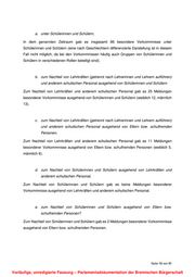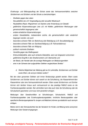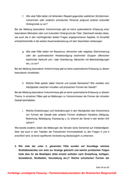 f. Wie viele Fälle hatten mit fehlendem Respekt gegenüber weiblichen Schülerinnen, Lehrerinnen oder anderem schulischen Personal aufgrund anderer kultureller Hintergründe zu tun? Bei der Meldung besonderer Vorkommnisse gibt es keine systematische Erfassung einer besonderen Motivation oder zum kulturellen Hintergrund der Täter. Gleichwohl werden diese, wie auch die in den nachfolgenden beiden Fragen angesprochenen Aspekte, im Einzelfall erforderlichenfalls in die weitere Auseinandersetzung mit dem Geschehen einbezogen. g. Wie viele Fälle hatten mit Rassismus, ethnischer oder religiöser Diskriminierung oder der systematischen Herabwürdigung bestimmter Gruppen (Menschen bestimmter Herkunft und / oder Orientierung, Menschen mit Beeinträchtigungen etc.) zu tun? Bei der Meldung besonderer Vorkommnisse gibt es keine systematische Erfassung zu diesen besonderen Umständen. h. Welche Rolle spielen dabei Internet und soziale Netzwerke? Wie verteilen sich Häufigkeiten zwischen virtuellen und physischen Formen der Gewalt? Bei der Meldung besonderer Vorkommnisse gibt es keine systematische Erfassung zu diesem Thema. In einzelnen Fällen gab es Meldungen zu Vorkommnissen die Formen der virtuellen Gewalt beinhalteten. i. Welche Entwicklungen und Veränderungen in den Häufigkeiten des Vorkommens von Formen der Gewalt oder anderer Formen strafbaren Handelns (Nötigung, Bedrohung, Beleidigung, Erpressung u. ä.) erkennt der Senat in den letzten fünf Jahren? Wie bereits erwähnt, bieten die Meldungen der Schulen keine Sicherheit auf Vollständigkeit. Aber wie auch in den Tabellen der Polizeilichen Kriminalstatistik zu den Fragen 3 und 4 ersichtlich wird, ist keine signifikante Veränderung diesbezüglich zu erkennen. 3. Wie viele der unter 2. genannten Fälle wurden auf Grundlage welches Straftatbestandes von wem zur Anzeige gebracht und welche juristischen Folgen hatte dies für die Beteiligten (bitte einzeln auflisten nach Einstellung, Auflagen, Sozialdienst, Strafbefehl, Verurteilung etc.)? Welche schulischen Formen der Seite 14 von 31 Vorlä ufige, unredigierte Fassung – Parlamentsdokumentation der Bremischen Bü rgerschaft