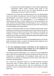 e. Wie bewertet der Senat dieses Meldesystem vor dem Hintergrund gegenwärtiger Entwicklungen? Welche Vorstufen (krimineller) Gewalt werden von dem Meldesystem erfasst oder ggf. auch nicht erfasst? Beabsichtigt der Senat Veränderungen und wenn ja, in welcher Art und Weise? Im Notfallordner für die Schulen gibt es die Gefährdungsgrade I bis III. Der Gefährdungsgrad I liegt in der unmittelbaren Verantwortung der Schule und umfasst z.B. Sachbeschädigungen oder Beleidigungen von Lehrerinnen und Lehrern, die durchaus als Vorstufe von Gewalt definiert werden könnten. In der Gefährdungsstufe II, in der Straftatbestände wie Körperverletzung oder Besitz von Waffen aufgeführt sind, ist die Zusammenarbeit mit der Polizei erforderlich. Bei Straftatbeständen der Gefährdungsstufe III wie z.B. Totschlag oder Schusswaffengebrauch liegt die unmittelbare Verantwortung bei der Polizei. Diese Einstufung der Gefährdungsgrade hat sich bislang bewährt. In Bremen und Bremerhaven besteht eine enge und bewährte Zusammenarbeit zwischen Schulleitungen, Schulaufsicht und Schulverwaltung sowie ein enger Austausch zwischen den schulischen Akteuren, den ReBUZ und der Polizei. Dieses Verfahren hat sich bewährt und ermöglicht ein schnelles und sensibles Reagieren auf Vorkommnisse physischer oder psychischer Gewalt. Diese werden individuell unter Berücksichtigung des jeweiligen Kontextes in Rücksprache mit den Beteiligten bearbeitet. In Bremerhaven ist für Herbst 2018 im Rahmen einer Beschäftigtenbefragung an den Schulen geplant, das bisherige Vorgehen zu evaluieren. Die Ergebnisse werden ausgewertet und die Praxis im Land Bremen wird ggf. angepasst werden. 2. Wie viele meldepflichtige besondere Vorkommnisse mit dem Hintergrund der psychischen oder physischen Gewalt ereigneten sich in den vergangenen drei Jahren jeweils an den Schulen in Bremen und Bremerhaven Die nachfolgend genannten Zahlenangaben (a. bis i.) beziehen sich auf die Stadtgemeinde Bremen. Diese sind einer Aufstellung über besondere Vorkommnisse entnommen, die von den Schulaufsichten für allgemeinbildende und berufsbildende Schulen geführt wird. Die Aufstellung wird auf Grundlage von Meldungen der Schulen erstellt und kann daher keine Sicherheit auf Vollständigkeit bieten. Die im Rahmen des vergleichbaren Verfahrens in der Stadt Bremerhaven gemeldeten Vorkommnisse werden im Schulamt bislang nicht statistisch erfasst. Die notwendigen Voraussetzungen hierfür werden aktuell im Zuge einer Umstrukturierung des Amtes geschaffen, mit denen eine landeseinheitliche Erfassung und deren Auswertung umgesetzt werden sollen. Seite 12 von 31 Vorlä ufige, unredigierte Fassung – Parlamentsdokumentation der Bremischen Bü rgerschaft