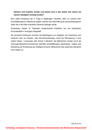 Sanktion sind ergriffen worden und welche sind in den letzten fünf Jahren mit welcher Häufigkeit verhängt worden? Eine valide Darstellung der in Frage 3 abgefragten Fallzahlen wäre nur anhand einer einzelfallbezogenen Fallprüfung möglich, welches eine Übermittlung der personenbezogenen Daten der in die Fälle involvierten Personen bedingen würde. Ersatzweise werden im Folgenden entsprechende Fallzahlen aus der polizeilichen Kriminalstatistik in Auszügen dargestellt. Als schulische Sanktionen kommen die Beauftragung von Aufgaben, der Ausschluss vom Unterricht oder von Klassen- oder Schulveranstaltungen sowie die Überweisung in eine andere Klasse / Lerngruppe oder Schule in Betracht. Die Maßnahmen werden durch die Ordnungsmaßnahmen-Konferenzen ebenfalls einzelfallbezogen beschlossen, sodass eine Darstellung der Entwicklung der Häufigkeit einzelner Maßnahmen über bestimmte Zeiträume nicht möglich ist. Seite 15 von 31 Vorlä ufige, unredigierte Fassung – Parlamentsdokumentation der Bremischen Bü rgerschaft