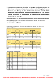 Tatverdächtigen-Tabelle Bremerhaven S E Heran- TV Kinder Jugendliche Erw achsene Jahr X w achsende insgesamt unter 14 14 < 18 ab 21 U 18 < 21 S 2015 M 3 1 1 1 2015 W 2015 G 3 1 1 1 2016 M 1 1 2016 W 2016 G 1 1 2017 M 4 2 1 1 2017 W 1 1 2017 G 5 2 2 1 Aus der Übersicht wird deutlich, dass es zu keiner signifikanten Erhöhung der Vorfälle gekommen ist. 5. Wie viele Krankmeldungen von Schülerinnen und Schülern und Lehrerinnen und Lehrern gab es in den letzten drei Jahren in Bremen und Bremerhaven aufgrund von psychischer Erkrankungen infolge a. von Gewalt (insbesondere körperlichen Übergriffen), b. ihren Vorstufen wie Mobbing, Beleidigungen oder Bedrohungen etc., c. wie lange waren die Opfer jeweils krankgemeldet? Inwieweit sind diese Faktoren insbesondere für Langzeiterkrankungen oder vorzeitiges Ausscheiden aus dem Beruf (besonders) verantwortlich? d. Wie bewertet der Senat den „Arbeitsplatz Klassenzimmer“ hinsichtlich gesundheitlicher Risiken und seiner Attraktivität vor dem Hintergrund der veränderten Bedingungen? e. Welche Auswirkungen haben diese Entwicklungen auf die Schule als Lernort? Krankmeldungen beinhalten lediglich die Dauer der Erkrankung, nicht jedoch die Art der Erkrankung. Weder ist der Arbeitnehmer verpflichtet, diese zu benennen noch darf der Arbeitgeber hiernach fragen. Insoweit liegen hierzu keine Daten vor. Auch ist eine ursächliche Verknüpfung, wie sie oben benannt wird, häufig nicht herstellbar. Psychische Erkrankungen zeigen sich oftmals erst sehr stark zeitverzögert und sind dann nur schwer in Verbindung mit gewaltförmigen Belastungssituationen in der Schule zu bringen. Seite 20 von 31 Vorlä ufige, unredigierte Fassung – Parlamentsdokumentation der Bremischen Bü rgerschaft
