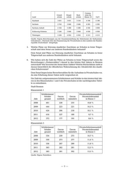 Stadt Bremerhaven*) Klassenstufe 1 Schülerinnen/ Privatschülerinnenanteil/ Schüler Davon Davon Privatschüleranteil Jahr gesamt weiblich männlich in Klasse 1 2008 126 64 62 13,5 % 2009 125 56 69 13,1 % 2010 131 55 76 14,1 % 2011 127 65 62 13,5 % 2012 124 51 73 13,0 % Klassenstufe 5 Schülerinnen/ Privatschülerinnenanteil/ Schüler Davon Davon Privatschüleranteil Jahr gesamt weiblich männlich in Klasse 5 2008 86 52 34 7,5 % 2009 84 48 36 8,0 % 2010 58 29 29 5,7 % 2011 110 59 51 11,0 % 2012 102 45 57 10,9 % *) Aus den statistischen Übersichten der Stadt Bremerhaven. Land Bremen Klassenstufe 1 Schülerinnen/ Privatschülerinnenanteil/ Schüler Davon Davon Privatschüleranteil Jahr gesamt weiblich männlich in Klasse 1 2008 587 292 295 11,3 % 2009 569 279 290 10,8 % 2010 555 261 294 10,8 % 2011 543 292 251 10,4 % 2012 496 228 268 9,4 % Klassenstufe 5 Schülerinnen/ Privatschülerinnenanteil/ Schüler Davon Davon Privatschüleranteil Jahr gesamt weiblich männlich in Klasse 5 2008 620 311 309 10,1 % 2009 634 321 313 10,7 % 2010 614 296 318 10,8 % 2011 673 341 332 12,2 % 2012 685 326 359 13,0 % Quelle: Eigene Statistiken. Die Zahl der Privatschülerinnen und Privatschüler in Klassenstufe 1 der Grund- schulen in der Stadtgemeinde Bremen ist danach kontinuierlich zurückgegan- — 6 —