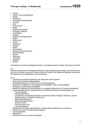 Thüringer Landtag - 6. Wahlperiode Drucksache 6/ 1920 • Fechten • Fitness- und Gesundheitssport • Fußball • Gerätturnen • Gymnastik/Gesundheitssport • Handball • Judo • Kanurennsport • Karate • Kickboxen/Thai-Boxen • Kindersport allgemein • Leichtathletik • Radsport • rhythmische Sportgymnastik • Ringen • Rollschuhlauf • Schach • Schwimmen • Seesport • Segeln • Seniorensport • Sportkurse Gesundheitssport • Sportschwimmen • Tanzen • Teakwondo • Tischtennis • Volleyball • Zumba Interessenten für weitere Sportangebote werden in die entsprechenden Thüringer Sportvereine vermittelt. Zu 4.: Der Anteil von Menschen mit Migrationshintergrund in den Stützpunktvereinen liegt im Durchschnitt bei cir ka 25 bis 40 Prozent. Es gibt auch Vereine mit über 50 Prozent. Eine Statistik für Migranten mit dauerhaf tem Bleiberecht und Asylbewerbern wird nicht erhoben. Zu 5.: • Unterbreitung sportlicher Angebote für die Zielgruppen des Programms • Benennung von Integrationsbeauftragten • Abholung/Fahrdienste von Teilnehmern zu den Sportangeboten • Einbindung von Migranten in Vereinsarbeit als Übungsleiter, Helfer, Vorstandstätigkeit • bei Eignung - Ausbildung als Übungsleiter • Mithilfe von Migranten bei Vereinsanlässen, zum Beispiel Organisation von Turnieren/Vereinsfesten • Zusammenarbeit mit dem Landessportbund, zum Beispiel gemeinsame Veranstaltungen wie: - Tag der Integration - Interkulturelle Woche - Turnierformen mit Integrationscharakter in Sportarten Fußball, Volleyball, Tischtennis, Gorodki - Integrationsturnier "All together Fußball Cup" - Weihnachtsfußballturnier - Weihnachtsvolleyballturnier - Gorodki-Turniere - "Fair Play Soccer Tour“ - Frauensportprojekte • Beteiligung an Qualifizierungsmaßnahmen und Bildungsveranstaltungen des Programms • Hilfe bei der Suche nach einem Ausbildungsplatz • Hausaufgabenhilfe • Deutschkurs • Hilfe bei der Suche nach einem Arbeitsplatz 3