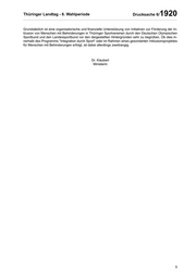 Thüringer Landtag - 6. Wahlperiode Drucksache 6/ 1920 Grundsätzlich ist eine organisatorische und finanzielle Unterstützung von Initiativen zur Förderung der In klusion von Menschen mit Behinderungen in Thüringer Sportvereinen durch den Deutschen Olympischen Sportbund und den Landessportbund vor den dargestellten Hintergründen sehr zu begrüßen. Ob dies in nerhalb des Programms "Integration durch Sport" oder im Rahmen eines gesonderten Inklusionsprojektes für Menschen mit Behinderungen erfolgt, ist dabei allerdings zweitrangig. Dr. Klaubert Ministerin 5