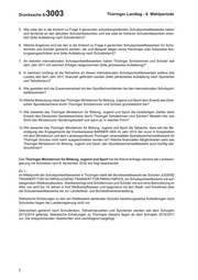 Thüringer Landtag 6. Wahlperiode Drucksache 6/ 09.11.2016 3003 Kleine Anfrage der Abgeordneten Rosin (SPD) und Antwort des Thüringer Ministeriums für Bildung, Jugend und Sport Sportunterricht und Bewegungsförderung an Thüringer Schulen - Schulsportwett- bewerbe Die Kleine Anfrage 1344 vom 17. August 2016 hat folgenden Wortlaut: Bereits in seinem Beschluss "Stärkung des Sports in Thüringer Kindergärten und Schulen" vom 22. Juni 2007 (vergleiche Drucksache 4/3136) hat der Thüringer Landtag zu Recht festgestellt: "Sportunterricht und Bewegungserziehung in den Bildungsinstitutionen leisten einen wichtigen Beitrag für die Bildung und Erziehung von Kindern, Jugendlichen und jungen Erwachsenen. Wegen der durch Bewe- gungsmangel, Fehlbelastungen und falsche Ernährung gekennzeichneten Alltagsabläufe kommen dem Sportunterricht und allen weiteren bewegungsorientierten Angeboten an Bildungseinrichtungen immer grö- ßere Bedeutung zu. Im Kindes- und Jugendalter soll neben der unmittelbaren Wirkung auch eine lebens- lange positive Einstellung zum Sporttreiben anerzogen werden." Wie unterschiedliche empirische Studien aus den vergangenen Jahren, eine kontinuierliche Medienbericht- erstattung zum Thema und Rückmeldungen aus der Schulpraxis sowie aus dem organisierten Sport zeigen, hat diese Einschätzung nach wie vor nichts an Aktualität eingebüßt. Es erscheint daher angebracht, zu Be- ginn des neuen Schuljahres 2016/2017 den aktuellen Stand des Sportunterrichts und der Bewegungsför- derung an den Thüringer Schulen detailliert zu hinterfragen. Ich frage die Landesregierung: 1. Wie viele Schülerinnen und Schüler welcher Schulen haben seit dem Jahr 2011 an Schulsportwettbe- werben teilgenommen (bitte jahresweise Aufstellung nach Schularten, Schulämtern, Schulen, Teilneh- merzahlen und Sportart)? 2. In welchem Umfang sind Organisation und Durchführung dieser Schulsportwettbewerbe seitens des Lan- des seit dem Jahr 2011 finanziell gefördert worden (bitte jahresweise Aufstellung nach Schulämtern)? 3. Wie gestaltet sich die Zusammenarbeit mit den Sportfachverbänden bei den Schulsportwettbewerben? Besteht hier aus Sicht der Landesregierung Handlungsbedarf und wenn ja, in welcher Form? 4. Wie viele schulinterne und schulübergreifende Schulsportwettbewerbe haben im Schuljahr 2015/2016 stattgefunden (bitte Aufstellung nach Schulämtern) und welche Sportarten sind bei diesen Schulsport- wettbewerben jeweils berücksichtigt worden (zum Beispiel Leichtathletik, Geräteturnen, Ballspiele, Gym- nastik, Schwimmen)? Druck: Thüringer Landtag, 13. Dezember 2016