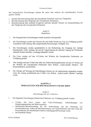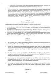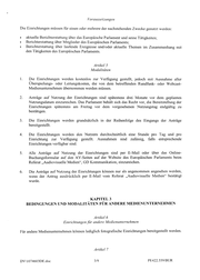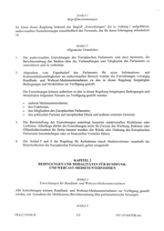 Artikel 1 Begriffsbesti11111111nge11 Im Sinne dieser Regelung bedeutet der Begriff ,,Einrichtungen" die in Anhang 1 aufgefuhrten audiovisuellen Dienstleistungen einschlieBlich des Personals, das fur deren Erbringung erforderlich ist. Artikel 2: Allgemeine Grundsatze 1. Die audiovisuellen Einrichtungen des Europaischen Parlaments sind dazu bestimmt, die Berichterstattung der Medien iiber die Verhandlungen und Tiitigkeiten des Parlaments zu unterstiitzen und zu verbreiten. 2. Abgesehen vom Eigenbedarf des Parlaments fur seine Informations- und Kommunikationstatigkeiten im audiovisuellen Bereich werden die Einrichtungen vorrangig Rundfunk- und Webcast-Medienunternehmen zu den in dieser Regelung festgelegten Bedingungen und Modalitaten zur Verfugung gestellt. Die Einrichtungen konnen aul3erdem zu den in dieser Regelung festgelegten Bedingungen und Modalitaten folgenden Nutzern zur Verfugung gestellt werden: • • • • anderen Medienunternehmen; den Fraktionen; den Mitgliedern des Europaischen Parlaments; den politischen Parteien auf europaischer Ebene und anderen externen Gremien. 3. Die Bereitstellung der Einrichtungen unterliegt keinerlei redaktionellen Richtlinien oder Leitlinien. Allerdings diirfen die Einrichtungen nicht fur Zwecke der Werbung, Reklame oder Offentlichkeitsarbeit fur Dritte benutzt werden, die Wiirde oder Ordnung des Europiiischen Parlaments beeintrachtigen oder zu finanziellen Vorteilen fuhren. 4. Die Artikel 5 und 6 der Regelung fur Aufnahmen <lurch Medienvertreter innerhalb der Riiumlichkeiten des Europaischen Parlaments gelten sinngemiil3. KAPITEL 2 BEDINGUNGEN UND MODALITATEN FUR RUNDFUNK- UND WEBCAST-MEDIENUNTERNEHMEN Artikel 3 Einrichtungenfiir Runclfunk- und Webcast-Medienzmternehmen Alle Einrichtungen konnen Rundfunk- und Webcast-Medienunternehmen zur Verfugung gestellt werden, mit Ausnahme der Multikamera-Berichterstattung iiber parlamentarische Sitzungen. Artikel 4 PE422.559/BUR 2/9 DV\l 074603DE.doc