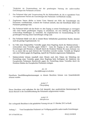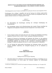BEDINGUNGEN UND MODALITATEN FUR POLITISCHE PARTEIEN AUF 2 EUROPAISCHER EBENE UND ANDERE EXTERNE GREMIEN Artikel J 2 Einrichtungen fur externe Gremien einschlief3lich der politischen Parteien m~f europiiischer Ebene Einrichtungen, die in Anhang I aufgefuhrt sind und die Nutzung der ortsfesten audiovisuellen Ausriistungen des Parlaments umfassen, konnen politischen Parteien auf europaischer Ebene und anderen extemen Gremien zur Verfugung gestellt werden. Artikel I 3 Voraussetzungen I. Die Bereitstellung der Generalsekretars. Einrichtungen unterliegt der vorherigen Genehmigung des 2. Die Einrichtungen miissen fur die Berichterstattung iiber aktuelle Themen betreffend die Tatigkeiten des Europaischen Parlaments oder der Europaischen Union benutzt werden. Artikel 14 Modalitiiten I. Exteme Gremien miissen die Kosten fur das bei der Nutzung der betreffenden Einrichtung eingesetzte Personal zu den in Artikel 9 Absatz 2 genannten Modalitaten iibemehmen. 2. Antrage auf Nutzung der Einrichtungen sind spatestens drei Monate vor dem geplanten Nutzungsdatum einzureichen. Das Parlament behalt sich das Recht vor, die Bereitstellung der Einrichtungen spatestens am Freitag vor dem vorgesehenen Nutzungstag endgiiltig zu bestatigen. Es behalt sich auBerdem das Recht vor, einen Antrag jederzeit zu annullieren. 3. Vor der Nutzung der audiovisuellen Einrichtungen des Parlaments miissen sich exteme Gremien schriftlich verptlichten, die vorliegende Regelung als fur sie verbindlich zu akzeptieren. KAPITEL 6: SCHLUSSBESTIMMUNGEN Artikel I 5 Hafiung und Durchsetzung der Regelung I. 2 Alle Nutzer mi.issen sich verpflichten, das Parlament fur jede Haftung zu entschadigen, die aus Schadensersatzklagen von Dritten gegen das Parlament aufgrund von rechtswidrigen Im Sinne der Verordnung (EG) Nr. 2004/2003 des Europaischen Parlaments und des Rates vom 4. November 2003. PE422.559/BUR 619 DV\1074603DE.doc