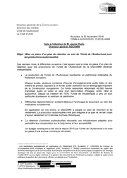 Parlement europeen Direction generale de la Communication Direction des medias Unite de l'audiovisuel Le Chef d'Unite Bruxelles, le 30 Novembre 2018 COMM-A-AUDIOVISUEL D (2018) 46989 Note a !'attention de M. Jaume Duch, Directeur general, DGCOMM Objet : Mise en place d'un plan de retention au sein de /'Unite de l'Audiovisuel pour les productions audiovisuel/es Ces derniers mois, a differentes occasions ii est apparu que la mise en place d'un plan de retention pour les productions de !'Unite de l'Audiovisuel de la DGCOMM devenait indispensable. • La production de !'Unite de l'Audiovisuel represente un patrimoine indeniable du Parlement europeen. Chaque annee, plusieurs centaines d'heures d'enregistrements audio-video et des milliers de photos s'ajoutent a ce fends. Cette collection est un temoignage important de la Construction europeenne. Ce fends rassemble desormais 40 OOO heures d'archives audio et video et plus d'un demi-million d'images, entre 1952 et aujourd'hui. Depuis sa creation en 1976, !'Unite de l'Audiovisuel a pris un soin particulier a preserver et valoriser ce patrimoine. • 1 Differentes reglementations existent deja pour l'archivage de document, au sein des Institutions europeennes. En application de ces textes, la DGCOMM a adopte un plan de retention et de versement. La production audiovisuelle n'est pas integree a ce plan et ne fait l'objet d'aucun versement a !'Unite des Archives Historiques. • La retention d'archives audiovisuelles necessite une infrastructure adaptee pour permettre leur conservation sur le long terme et leur accessibilite. Un budget consequent a ete alloue depuis 2010 par l'Unite de l'Audiovisuel a la mise en place d'une archive numerique securisee. 1 Les Institutions europeennes en application du Reglement (CE, Euratom) n° 1700/2003 du Conseil du 22 septembre 2003 modifiant le reglement (CEE, Euratom) n° 354/83 concernant l'ouverture au public des archives historiques de la Communaute economique europeenne et de la Communaute europeenne de l'energie atomique ont mis en place des regles pour la conservation de leurs documents. La decision du Bureau du 2 juillet 2012 sur Jes regles relatives a la gestion des documents au Parlement europeen a etabli le cadre d'une politique de gestion des documents efficace et globale pour I' Institution.