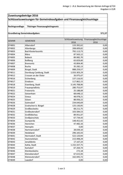Anlage 1 i.R.d. Beantwortung der Kleinen Anfrage 6/720 Angaben in EUR Zuweisungsbeträge 2016 Schlüsselzuweisungen für Gemeindeaufgaben und Finanzausgleichsumlage Rechtsgrundlage: Thüringer Finanzausgleichsgesetz Grundbetrag Gemeindeaufgaben: 571,57 Schlüsselzuweisung Finanzausgleichsumlage GEMNR GEMEINDE 2016 2016 074001 Albersdorf 133.392,62 0,00 074002 Altenberga 208.609,82 0,00 074003 Bad Klosterlausnitz 792.113,73 0,00 074004 Bibra 87.563,12 0,00 074005 Bobeck 89.982,70 0,00 074006 Bollberg 63.829,60 0,00 074007 Bremsnitz 43.804,40 0,00 074008 Bucha 35.282,13 0,00 074009 Bürgel, Stadt 888.259,57 0,00 074011 Dornburg-Camburg, Stadt 1.033.303,29 0,00 074012 Crossen an der Elster 26.975,67 0,00 074016 Eichenberg 137.116,92 0,00 074017 Eineborn 117.862,15 0,00 074018 Eisenberg, Stadt 3.145.708,96 0,00 074019 Frauenprießnitz 280.753,97 0,00 074021 Freienorla 25.188,69 0,00 074022 Geisenhain 68.648,12 0,00 074024 Gneus 48.978,21 0,00 074025 Gösen 88.956,22 0,00 074026 Golmsdorf 234.640,69 0,00 074028 Graitschen b. Bürgel 125.130,95 0,00 074029 Großbockedra 68.211,75 0,00 074031 Großeutersdorf 103.584,53 0,00 074032 Großlöbichau 89.951,07 0,00 074033 Großpürschütz 67.734,43 0,00 074034 Gumperda 148.452,42 0,00 074036 Hainichen 47.482,16 0,00 074037 Hainspitz 0,00 0,00 074038 Hartmannsdorf 28.039,10 0,00 074039 Heideland 296.165,43 0,00 074041 Hermsdorf, Stadt 522.120,94 0,00 074042 Hummelshain 215.498,29 0,00 074043 Jenalöbnitz 17.167,24 0,00 074044 Kahla, Stadt 1.232.337,75 0,00 074045 Karlsdorf 67.264,74 0,00 074046 Kleinbockedra 272,18 0,00 074047 Kleinebersdorf 67.615,94 0,00 074048 Kleineutersdorf 162.045,72 0,00 074049 Laasdorf 0,00 0,00 1 von 3