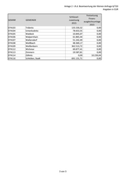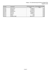 Anlage 1 i.R.d. Beantwortung der Kleinen Anfrage 6/720 Angaben in EUR Schlüsselzuweisung Finanzausgleichsumlage GEMNR GEMEINDE 2016 2016 074107 Waltersdorf 36.986,95 0,00 074108 Weißbach 52.628,45 0,00 074109 Weißenborn 340.213,79 0,00 074112 Wichmar 58.848,97 0,00 074113 Zimmern 28.497,41 0,00 074114 Zöllnitz 0,00 0,00 074116 Schkölen, Stadt 494.157,97 0,00 3 von 3