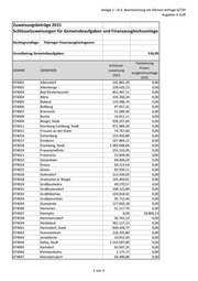 Anlage 2 i.R.d. Beantwortung der Kleinen Anfrage 6/720 Angaben in EUR Zuweisungsbeträge 2015 Schlüsselzuweisungen für Gemeindeaufgaben und Finanzausgleichsumlage Rechtsgrundlage: Thüringer Finanzausgleichsgesetz Grundbetrag Gemeindeaufgaben: 616,99 Festsetzung Schlüssel- Finanz- GEMNR GEMEINDE zuweisung ausgleichsumlage 2015 2015 074001 Albersdorf 142.861,29 0,00 074002 Altenberga 238.620,13 0,00 074003 Bad Klosterlausnitz 852.497,11 0,00 074004 Bibra 103.266,24 0,00 074005 Bobeck 110.586,74 0,00 074006 Bollberg 87.957,31 0,00 074007 Bremsnitz 51.089,36 0,00 074008 Bucha 16.911,11 0,00 074009 Bürgel, Stadt 928.227,63 0,00 074011 Dornburg-Camburg, Stadt 972.969,24 0,00 074012 Crossen an der Elster 74.767,60 0,00 074016 Eichenberg 153.950,89 0,00 074017 Eineborn 107.804,11 0,00 074018 Eisenberg, Stadt 2.382.048,64 0,00 074019 Frauenprießnitz 253.152,05 0,00 074021 Freienorla 53.859,40 0,00 074022 Geisenhain 68.304,24 0,00 074024 Gneus 64.213,54 0,00 074025 Gösen 82.920,11 0,00 074026 Golmsdorf 213.420,03 0,00 074028 Graitschen b. Bürgel 145.404,81 0,00 074029 Großbockedra 69.270,57 0,00 074031 Großeutersdorf 108.125,89 0,00 074032 Großlöbichau 103.818,42 0,00 074033 Großpürschütz 92.712,44 0,00 074034 Gumperda 127.603,18 0,00 074036 Hainichen 51.117,70 0,00 074037 Hainspitz 0,00 18.806,13 074038 Hartmannsdorf 56.761,13 0,00 074039 Heideland 361.117,13 0,00 074041 Hermsdorf, Stadt 690.428,77 0,00 074042 Hummelshain 218.291,80 0,00 074043 Jenalöbnitz 10.915,50 0,00 074044 Kahla, Stadt 1.535.697,89 0,00 074045 Karlsdorf 63.507,33 0,00 074046 Kleinbockedra 1.175,72 0,00 074047 Kleinebersdorf 64.496,88 0,00 1 von 3