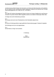 Thüringer Landtag 6. Wahlperiode Drucksache 6/ 19.04.2017 3777 Kleine Anfrage des Abgeordneten Brandner (AfD) und Antwort des Thüringer Ministeriums für Inneres und Kommunales Angeblicher Vorfall in Saalfeld am 5. März 2017 Die Kleine Anfrage 2012 vom 10. März 2017 hat folgenden Wortlaut: Der Netzausgabe des "Saale Journal" vom 7. März 2017 war unter anderem Folgendes zu entnehmen: "... Zeugen werden auch zu einer ... Auseinandersetzung gesucht, welche sich am Sonntagabend im Rainweg in Saalfeld ereignet haben soll. Ein 25-jähriger Asylbewerebr (sic) aus dem Irak schilderte am Montag der Polizei, dass er tags zuvor gegen 18.00 Uhr unweit des Klinikums offenbar durch zwei Syrer beleidigt, be- droht und zu Boden gestoßen wurde. Die beiden jungen Männer hätten abfällige Bemerkungen zum Aus- sehen des Irakers gemacht, bevor sie auf offener Straße auf ihn eingetreten und eingeschlagen hätten. Der 25-Jährige wurde dabei verletzt. Nun werden Zeugenhinweise zur Identität der noch unbekannten Syrer ge- sucht. Es wird wegen des Verdachts der gefährlichen Körperverletzung ermittelt. ..." Ich frage die Landesregierung: 1. Was genau hat sich anlässlich des einleitend geschilderten Sachverhalts ereignet? 2. Wie viele Polizeikräfte waren wegen des Vorfalls im Einsatz? 3. Wie viele Ermittlungsverfahren wegen welcher Tatbestände wurden im Zusammenhang mit dem Vorfall gegen Personen mit welchem Alter, welchem Geschlecht und welcher Staatsangehörigkeit (bitte sämt- liche, auch gegebenenfalls vorherige) eingeleitet? Wie war jeweils der Ausgang der Ermittlungsverfah- ren (Einstellung/Anklage/Strafbefehl; bei Einstellung bitte Grund und gegebenenfalls Auflage mitteilen)? 4. Sind die Tatverdächtigen, gegen die Ermittlungsverfahren eingeleitet worden sind, bereits in der Vergan- genheit polizeilich auffällig geworden (Vorstrafen)? Wie war deren Aufenthaltsstatus? Das Thüringer Ministerium für Inneres und Kommunales hat die Kleine Anfrage namens der Landesre gierung mit Schreiben vom 18. April 2017 wie folgt beantwortet: Vorbemerkung: Der Vorfall ist Gegenstand strafrechtlicher Ermittlungen (Stand: 5. April 2017). Unter Hinweis auf Artikel 67 Absatz 3 Satz 1 Nummer 1 der Verfassung des Freistaats Thüringen und § 477 Absatz 2 Satz 1 der Straf- prozessordnung wird insbesondere aus Datenschutzgründen (Grundrecht der informationellen Selbstbe- stimmung nach Artikel 2 Absatz 1 in Verbindung mit Artikel 1 Absatz 1 Grundgesetz, Artikel 6 Absatz 2 der Verfassung des Freistaats Thüringen) und vor dem Hintergrund der im Strafverfahren zu beachtenden Un- Druck: Thüringer Landtag, 5. Mai 2017