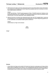 Thüringer Landtag - 7. Wahlperiode Drucksache 7/ 1570 4. Welche Kommunen haben noch keine Jahresrechnung für das Jahr 2019 erstellt und ihren Gemeinderä- ten zur Beratung und Feststellung mit welcher Begründung zugeleitet (bitte nach Landkreisen und kreis- freien Städten getrennt aufführen)? Antwort: In dem nach § 80 Abs. 2 ThürKO beziehungsweise § 19 Abs. 2 ThürKDG bestimmten Verfahren ist die Rechtsaufsichtsbehörde nicht zu beteiligen. Die Rechtsaufsichtsbehörde hat daher grundsätzlich keine Kenntnis davon, ob die dort bestimmten Fristen eingehalten werden. 5. Welchen Kommunen, die bisher keine Jahresrechnung für das Jahr 2019 vorgelegt haben, wurde eine Fristverlängerung durch die jeweiligen Rechtsaufsichtsbehörden mit welcher Begründung gewährt (bit- te nach Landkreisen und kreisfreien Städten getrennt aufführen)? Antwort: Auf die Antwort zu Frage 3 wird verwiesen. Maier Minister Anlage* Endnote: * Auf den Abdruck der Anlage wurde verzichtet. Ein Exemplar der Antwort der Landesregierung mit Anlage erhielten jeweils vorab der Fragesteller und die Fraktionen. In der Landtagsbibliothek liegt diese Drucksache mit Anlage zur Einsichtnahme bereit. Des Weiteren kann sie unter der oben genannten Drucksachennummer im Abgeordnetenin- formationssystem sowie im Internet unter der Adresse: www.parldok.thueringen.de eingesehen werden. 3