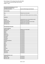 Kleine Anfrage Nr. 675 des Abgeordneten Bilay (DIE LINKE) - Kommunen ohne Jahresrechnungen 2018 und 2019 - Anlage zu Frage 1 Den Rechtsaufsichtsbehörden noch nicht vorliegende Jahresrechnungen / Jahresabschlüsse 2018 Grund der Nichtvorlage (soweit bekannt) Emleben Prüfbericht noch nicht erstellt Eschenbergen Prüfbericht noch nicht erstellt Friedrichroda, Stadt Prüfbericht noch nicht erstellt Friemar Prüfbericht noch nicht erstellt Gierstädt Prüfbericht noch nicht erstellt Gotha, Stadt Prüfbericht noch nicht erstellt Großfahner Prüfbericht noch nicht erstellt Herrenhof Prüfbericht noch nicht erstellt Luisenthal Prüfbericht noch nicht erstellt Molschleben Prüfbericht noch nicht erstellt Nottleben Prüfbericht noch nicht erstellt Ohrdruf, Stadt Prüfbericht noch nicht erstellt Pferdingsleben Prüfbericht noch nicht erstellt Schwabhausen Prüfbericht noch nicht erstellt Sonneborn Prüfbericht noch nicht erstellt Bad Tabarz Prüfbericht noch nicht erstellt Tambach-Dietharz/Thür. Wald, Stadt Prüfbericht noch nicht erstellt Tonna Prüfbericht noch nicht erstellt Tröchtelborn Prüfbericht noch nicht erstellt Tüttleben Prüfbericht noch nicht erstellt Waltershausen, Stadt Prüfbericht noch nicht erstellt Zimmernsupra Prüfbericht noch nicht erstellt Nesse-Apfelstädt Prüfbericht noch nicht erstellt Hörsel Prüfbericht noch nicht erstellt Drei Gleichen Prüfbericht noch nicht erstellt Nessetal Prüfbericht noch nicht erstellt Georgenthal Prüfbericht noch nicht erstellt Landkreis Hildburghausen Ahlstädt nicht bekannt Beinerstadt nicht bekannt Bischofrod nicht bekannt Brünn/Thür. nicht bekannt Dingsleben nicht bekannt Ehrenberg nicht bekannt Eichenberg nicht bekannt Eisfeld, Stadt nicht bekannt Grimmelshausen nicht bekannt Grub nicht bekannt Henfstädt nicht bekannt Hildburghausen, Stadt nicht bekannt Kloster Veßra nicht bekannt Lengfeld nicht bekannt Marisfeld nicht bekannt Oberstadt nicht bekannt Reurieth nicht bekannt Seite 3 von 9