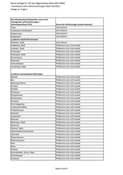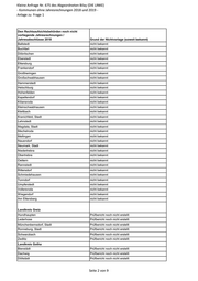 Kleine Anfrage Nr. 675 des Abgeordneten Bilay (DIE LINKE) - Kommunen ohne Jahresrechnungen 2018 und 2019 - Anlage zu Frage 1 Den Rechtsaufsichtsbehörden noch nicht vorliegende Jahresrechnungen / Jahresabschlüsse 2018 Grund der Nichtvorlage (soweit bekannt) Werther Prüfbericht noch nicht erstellt Heringen/Helme, Stadt Prüfbericht noch nicht erstellt Saale-Holzland-Kreis Albersdorf nicht bekannt Altenberga nicht bekannt Bad Klosterlausnitz nicht bekannt Bibra nicht bekannt Bucha nicht bekannt Bürgel, Stadt nicht bekannt Dornburg-Camburg, Stadt nicht bekannt Crossen an der Elster nicht bekannt Eichenberg nicht bekannt Frauenprießnitz nicht bekannt Freienorla nicht bekannt Gneus nicht bekannt Gösen nicht bekannt Graitschen b. Bürgel nicht bekannt Hainichen nicht bekannt Hainspitz nicht bekannt Hartmannsdorf nicht bekannt Heideland nicht bekannt Hermsdorf, Stadt nicht bekannt Hummelshain nicht bekannt Kahla, Stadt nicht bekannt Karlsdorf nicht bekannt Kleinbockedra nicht bekannt Kleinebersdorf nicht bekannt Kleineutersdorf nicht bekannt Lehesten nicht bekannt Löberschütz nicht bekannt Mertendorf nicht bekannt Meusebach nicht bekannt Möckern nicht bekannt Nausnitz nicht bekannt Ottendorf nicht bekannt Petersberg nicht bekannt Poxdorf nicht bekannt Rattelsdorf nicht bekannt Rauschwitz nicht bekannt Rothenstein nicht bekannt Ruttersdorf-Lotschen nicht bekannt Scheiditz nicht bekannt St.Gangloff nicht bekannt Stadtroda, Stadt nicht bekannt Seite 5 von 9
