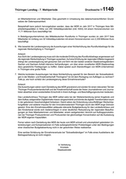 Drucksache 7/ 1140 Thüringer Landtag - 7. Wahlperiode Einen Widerspruch zu früheren Antworten sehen wir nicht, da wir davor keine entsprechenden Daten zu den Gesamtaufwendungen übermittelt haben. Klar ist aber auch, dass es sich bei allen diesen Berechnun- gen nur um Näherungswerte handeln kann." Dieser Darstellung des MDR schließt sich die Landesregierung nicht an, da die vorgenommene Berech- nung nicht die tatsächlichen regionalen Effekte widerspiegelt. Es wird ein Mehrwert für Thüringen ausge- wiesen, den es so tatsächlich nicht gibt. 1. Wie hoch sind die jährlichen Mehreinnahmen für den MDR nach Kenntnis der Landesregierung im Er- gebnis der ab 2021 geplanten Erhöhung des Rundfunkbeitrages? Antwort: Die Mehreinnahmen des MDR würden sich nach der Erhöhung des monatlichen Rundfunkbeitrags auf 18,36 Euro in den Jahren ab 2021 auf folgende Beträge belaufen: T€ 2021 2022 2023 2024 Beit ragseinnahmen bei Beit rag mt l. 17,50 581.212 584.023 584.442 581.821 € Beit ragseinnahmen bei Beit rag mt l. 18,36 599.992 605.774 604.915 600.348 € M ehreinnahmen bei 18.780 21.751 20.473 18.527 Beit ragserhöhung Die Zahlen für den Zeitraum 2021-2024 enthalten noch keine Ertragsminderungseffekte aufgrund der aktuellen Corona-Pandemie. Es ist aber davon auszugehen, dass im Zuge der Pandemie-Lage die An- zahl der Befreiungen sowohl im Privaten wie auch im Nicht-Privaten Bereich steigen wird. Valide Zah- len hierzu sind frühestens im Herbst 2020 zu erwarten. Eine Anhebung des monatlichen Rundfunkbeitrages auf 18,36 Euro bedeutet für den MDR einen Anstieg der Beitragserträge von 0,9 Prozent p. a., die Preissteigerungen werden jedoch deutlich höher liegen. Daher wird der MDR nach seiner Darstellung trotz der Beitragserhöhung eine Absenkung des jährlichen Haushaltes im zweistelligen Millionen-Bereich vornehmen müssen. 2. Wie hoch war der Anteil Thüringens an den Einnahmen des MDR in den Jahren 2016, 2017, 2018 und 2019 (bitte für jedes Jahr einzeln aufführen)? Antwort: Der Anteil von Thüringen an den Beitragserträgen in den Jahren 2016 bis 2019 stellt sich wie folgt dar: 2016 2017 2018 2019 M DR gesamt T€ 587.550 585.475 581.236 586.987 Thüringen T€ 149.174 147.272 145.073 144.879 Ant eil % 25,4% 25,2% 25,0% 24,7% 3. Wie viel Mittel aus diesem Anteil flossen in 2016, 2017, 2018 und 2019 tatsächlich nach Thüringen? Antwort: Gemäß § 7 Abs. 2 MDR-Finanzordnung dienen alle Erträge und Mittelaufbringungen des MDR als De- ckung für alle Aufwendungen und Mittelverwendungen (Grundsatz der Gesamtdeckung). Eine Statistik zum überschneidungsfreien Nachweis der Mittelverwendung nach Staatsvertragsländern wird im MDR nicht geführt. Allenfalls kann eine Separierung über die im Wirtschaftsplan enthaltene Organisations- struktur hergestellt werden. Diese kann aber auch nur unvollständig bleiben, da auch in den Zentralbe- 2