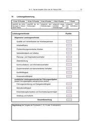 Nr. 2 - Tag der Ausgabe: Erfurt, den 28. Februar 2020 73 IV. Leistungsbewertung 13 bis 15 Punkte 10 bis 12 Punkte 5 bis 9 Punkte 2 bis 4 Punkte 1 Punkt übertrifft die Anfor- übertrifft die An- entspricht den entspricht einge- entspricht nicht derungen in beson- forderungen Anforderungen schränkt den den Anforderun- derenn Maße Anforderungen gen Leistungsmerkmale Punkte Allgemeine Leistungsmerkmale Qualität und Verwertbarkeit der Arbeitsergebnisse Arbeitseffizienz Problemlösungsorientiertes Arbeiten Selbstständigkeit und Initiative Planungs- und Organisationsverhalten Zielentwicklung Kommunikations- und Informationsverhalten Zusammenarbeit und teamorientiertes Verhalten Konfliktfähigkeit Kooperationsfähigkeit zusätzliche Leistungsmerkmale bei Führungsaufgaben (soweit Führungsaufgaben wahrgenommen werden) Führungsorientierung und Delegationsfähigkeit Motivationsfähigkeit Entscheidungskompetenz und Durchsetzungsvermögen Anleitung und Aufsicht Gesamtbewertung Begründung (bei Vergabe der Punktwerte 1, 13, 14 oder 15 erforderlich):