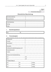 Nr. 2 - Tag der Ausgabe: Erfurt, den 28. Februar 2020 71 Anlage 2 (zu § 8 Abs. 3) Vertraulich behandeln Dienstliche Beurteilung Beurteilende Behörde: Personal-Nummer: Art der Beurteilung: Stichtag: Anlass: 1. Beurteilungszeitraum VOM bis 11. Personalangaben Diese Angaben werden von der personalverwaltenden Stelle aus nefüllt! Familienname Vorname Geburtsdatum Dienststelle Amtsbezeichnung/Besoldungsgruppe, seit Organisationseinheit Funktion Zeitraum einer Schwerbehinderung vom bis vom bis Teilzeitbeschäftigung vom bis Umfang vom bis Umfang vom bis Umfang