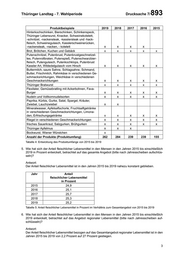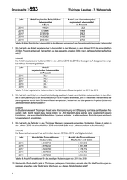 Thüringer Landtag - 7. Wahlperiode Drucksache 7/ 893 Produktbeispiele 2019 2018 2017 2016 2015 Hinterkochschinken, Bierschinken, Schinkenspeck, Thüringer Leberwurst, Knacker, Schweinekotelett, -schnitzel, -nackensteak, -kasslersteak und -hack- fleisch, Schweinegulasch, Kasslerschweinerücken, -nackensteak, -nacken, - kotelett x x x x Brot, Brötchen, Kuchen und Gebäck x x x x x Putenschnitzel, Putenbrust, Putenbrustgeschnetzel- tes, Putenrollbraten, Putenspieß, Putenschwarzbier- fleisch, Putengulasch, Putenkochklops, Putenbrust Kassler Art, Wildedelgulasch vom Hirsch x x x x x Buttermilch, saure Sahne, Schlagsahne, Schmand, Butter, Frischmilch, Rahmkäse in verschiedenen Ge- schmacksrichtungen, Weichkäse in verschiedenen Geschmacksrichtungen x x x x x Thüringer Bratwurst x x x x x Flexitaler, Gemüsebratling mit Ackerbohnen, Fava- Burger x x x x x Nudeln und Vollkornnudelsorten x x x x x Paprika, Kürbis, Gurke, Salat, Spargel, Kräuter, Zwiebel, Lauchzwiebel x x Mineralwasser, Apfelsaftschorle, Fruchtsaftgetränke in verschiedenen Geschmacksrichtungen, Limona- den, Erfrischungsgetränke x x x x x Riegel in verschiedenen Geschmacksrichtungen x x x x x frisches Sauerkraut, Salzgurken, Brühgurken x x x x x Thüringer Apfelmus x x x Bockwurst, Wiener Würstchen x Anzahl der Produkte (Produktumfang) 262 284 239 239 155 Tabelle 4: Entwicklung des Produktumfangs von 2015 bis 2019 5. Wie hat sich der Anteil fleischlicher Lebensmittel in den Mensen in den Jahren 2015 bis einschließlich 2019 in Prozent entwickelt, betrachtet auf das gesamte Angebot (bitte nach Jahresscheiben aufschlüs- seln)? Antwort: Der Anteil fleischlicher Lebensmittel ist in den Jahren 2015 bis 2019 nahezu konstant geblieben. Jahr Anteil fleischlicher Lebensmittel in Prozent 2015 24,9 2016 25,1 2017 25,7 2018 25,3 2019 25,2 Tabelle 5: Anteil fleischlicher Lebensmittel in Prozent im Verhältnis zum Gesamtangebot von 2015 bis 2019 6. Wie hat sich der Anteil fleischlicher Lebensmittel in den Mensen in den Jahren 2015 bis einschließlich 2019 entwickelt, betrachtet auf das Angebot regionaler Lebensmittel (bitte nach Jahresscheiben auf- schlüsseln)? Antwort: Der Anteil fleischlicher Lebensmittel bezogen auf das Gesamtangebot regionaler Lebensmittel ist in den Jahren 2015 bis 2019 von 2,2 Prozent auf 27 Prozent gestiegen. 3