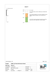 Schurf 6 m u. GOK (0,00 m NN) 0,0 0,00 0,10 Asphalt 0,10 0,25 Packlage, Beton, Zement, Bauschutt, Auffüllung, grau, feucht, mäßig schwer zu bohren 0,25 0,50 Feinsand; Ziegelbruch, sehr schwach feinkiesig, Auffüllung, schwarz bis dunkelbraun, feucht, mäßig schwer zu bohren -0,5 0,50 1,00 Schluff; schwach feinsandig bis feinsandig, tonig, fluviatil, grau, feucht, mäßig schwer zu bohren, Endteufe -1,0 1,00 Höhenmaßstab: 1:20 Blatt 1 von 1 Projekt: 13849 / OU Paul-Dohrmann-Schule Bohrung: Schurf 6 Auftraggeber: LH Hannover Rechtswert: 0 Bohrfirma: M&P Geonova GmbH Hochwert: 0 Bearbeiter: M.Kluge Ansatzhöhe: 0,00m Datum: 03.12.2013 Anlage 3.2 Endtiefe: 1,00m