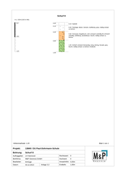 Schurf 5 m u. GOK (0,00 m NN) 0,0 0,00 0,10 Asphalt 0,10 0,30 Packlage, Beton, Zement, Auffüllung, grau, feucht bis sehr feucht 0,30 0,50 Feinsand; Ziegelbruch, Auffüllung, dunkelbraun, feucht, mäßig schwer zu bohren -0,5 0,50 1,00 Feinsand; sehr schwach schluffig bis schwach schluffig, humose Einlagerungen, fluviatil, beige bis gelb, feucht, mäßig schwer zu bohren, Endteufe -1,0 1,00 Höhenmaßstab: 1:20 Blatt 1 von 1 Projekt: 13849 / OU Paul-Dohrmann-Schule Bohrung: Schurf 5 Auftraggeber: LH Hannover Rechtswert: 0 Bohrfirma: M&P Geonova GmbH Hochwert: 0 Bearbeiter: M.Kluge Ansatzhöhe: 0,00m Datum: 03.12.2013 Anlage 3.2 Endtiefe: 1,00m