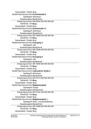 Sachbegriff: Fabrik Ausweisungsart: Baudenkmal Erfassungsnummer: 094 05528 000 000 000 000 Gemeinde / Ort: Burg Gemeindeteil / Ortsteil: Burg Straße/Platz/Hausnummer: Kirchhofstraße Lage: auf ehemaligem Westfriedhof hinter der Schwimmhalle Sachbegriff: Ehrenmal Ausweisungsart: Baudenkmal Erfassungsnummer: 094 86759 000 000 000 000 Gemeinde / Ort: Burg Gemeindeteil / Ortsteil: Burg Straße/Platz/Hausnummer: Kirchhofstraße Lage: auf dem ehemaligen Westfriedhof Sachbegriff: Ehrenmal Ausweisungsart: Baudenkmal Erfassungsnummer: 094 86760 000 000 000 000 Gemeinde / Ort: Burg Gemeindeteil / Ortsteil: Burg Straße/Platz/Hausnummer: Kirchhofstraße Lage: auf dem ehemaligen Westfriedhof, Ecke Blumenthaler Straße / Kirchhofstraße Sachbegriff: Friedhof Bauwerksname: reformierter Friedhof Ausweisungsart: Baudenkmal Erfassungsnummer: 107 05023 000 000 000 000 Gemeinde / Ort: Burg Gemeindeteil / Ortsteil: Burg Straße/Platz/Hausnummer: Kirchhofstraße Lage: an der Kirchhofstraße gelegen, gegenüber der Schwimmhalle, abgesperrtes Gelände Sachbegriff: Friedhof Ausweisungsart: Baudenkmal Erfassungsnummer: 094 05583 000 000 000 000 Gemeinde / Ort: Burg Gemeindeteil / Ortsteil: Burg Straße/Platz/Hausnummer: Kirchhofstraße Lage: auf ehemaligem Westfriedhof westlich von der Gedenkstätte zu Ehren der Gefallenen des II. Weltkriegs Sachbegriff: Denkmal Ausweisungsart: Kleindenkmal Erfassungsnummer: 094 10166 000 000 000 000 Gemeinde / Ort: Burg 25.02.2015 Die Benutzungsordnung des Landesamtes für Denkmalpflege und Seite 24 von 110 Rene Kaiser Archäologie Sachsen-Anhalt ist zu beachten !