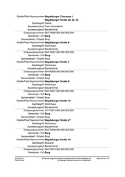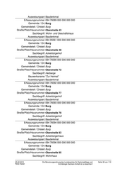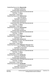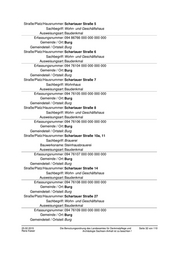 Gemeindeteil / Ortsteil: Burg Straße/Platz/Hausnummer: Kirchhofstraße 9 Sachbegriff: Wohnhaus Ausweisungsart: Baudenkmal Erfassungsnummer: 094 86763 000 000 000 000 Gemeinde / Ort: Burg Gemeindeteil / Ortsteil: Burg Straße/Platz/Hausnummer: Klosterstraße 13 Sachbegriff: Wohnhaus Ausweisungsart: Baudenkmal Erfassungsnummer: 094 76209 000 000 000 000 Gemeinde / Ort: Burg Gemeindeteil / Ortsteil: Burg Straße/Platz/Hausnummer: Kreuzgang 3 Sachbegriff: Villa Ausweisungsart: Baudenkmal Erfassungsnummer: 094 76208 000 000 000 000 Gemeinde / Ort: Burg Gemeindeteil / Ortsteil: Burg Straße/Platz/Hausnummer: Kreuzgang 4 Sachbegriff: Villa Ausweisungsart: Baudenkmal Erfassungsnummer: 094 76055 000 000 000 000 Gemeinde / Ort: Burg Gemeindeteil / Ortsteil: Burg Straße/Platz/Hausnummer: Lüdersdorfer Straße 5 Sachbegriff: Wohnhaus Ausweisungsart: Baudenkmal Erfassungsnummer: 094 76172 000 000 000 000 Gemeinde / Ort: Burg Gemeindeteil / Ortsteil: Burg Straße/Platz/Hausnummer: Magdalenenplatz Sachbegriff: Pumpe Ausweisungsart: Kleindenkmal Erfassungsnummer: 094 76181 000 000 000 000 Gemeinde / Ort: Burg Gemeindeteil / Ortsteil: Burg Straße/Platz/Hausnummer: Magdalenenplatz 1 Sachbegriff: Wohn- und Geschäftshaus Ausweisungsart: Baudenkmal Erfassungsnummer: 094 76068 000 000 000 000 Gemeinde / Ort: Burg Gemeindeteil / Ortsteil: Burg 25.02.2015 Die Benutzungsordnung des Landesamtes für Denkmalpflege und Seite 25 von 110 Rene Kaiser Archäologie Sachsen-Anhalt ist zu beachten !
