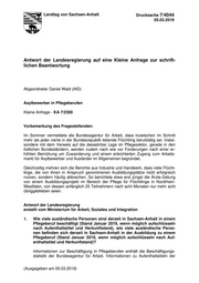 2 beschäftigten Ausländer*innen sind nicht Bestandteil der Statistik und können daher nicht ausgewiesen werden. Die aktuell vorliegenden Daten zum Stichtag 30.06.2018 sind in der nachstehenden Tabelle ausgewiesen. Beschäftigte Ausländer*innen in Pflegeberufen (Kranken- und Altenpflege, Be- rufsgruppen der KldB 2010: 813 und 821) in Sachsen-Anhalt einschl. SV- pflichtige Beschäftigte, Auszubildende und geringfügig Beschäftigte 813: Gesundheits- und Kran- 821: Altenpflege kenpflege, Rettungsdienst, Geburtshilfe Ausländer*innen insgesamt 328 269 darunter: Albanien 12 10 Arabische Republik Syrien 25 11 China 12 --- Kasachstan 10 --- Kroatien --- 9 Polen 14 25 Rumänien 10 8 Russische Föderation 29 18 Tschechien --- 7 Türkei --- 6 Ukraine 34 13 Ungarn 26 --- Vietnam 13 40 Übrige Staaten 143 122 Auszubildende 52 66 Quelle: Bundesagentur für Arbeit, Stichtag 30.06.2018 Methodische und inhaltliche Hinweise: Aus Datenschutzgründen und Gründen der statistischen Geheimhaltung werden Zahlenwerte von 1 oder 2 und Daten, aus denen rechnerisch auf einen solchen Zahlenwert geschlossen werden kann, anonymisiert. Die Gesamtzahl der beschäftigten Ausländer*innen enthält auch Fälle ohne Staatsangehörigkeit. Bei der Interpretation der Angaben ist zu beachten, dass Pflegekräfte an Berufsfachschulen ausgebil- det werden (sog. schulische Ausbildungen). Die in den obigen Angaben enthaltenen „Auszubildenden“ gehen nur dann in die Statistik ein, wenn sie zum Zeitpunkt der Datenerhebung sozialversicherungs- pflichtige Praktika in einem Unternehmen absolvieren. Im Schuljahr 2017/18 lernten im Bereich der Altenpflege insgesamt 1.956 Schü- ler*innen, darunter 63 (3,22 %) mit ausländischer Staatsangehörigkeit. Aus Daten- schutzgründen und Gründen der statistischen Geheimhaltung werden Zahlenwerte von 1 oder 2 anonymisiert. Informationen zum Herkunftsland können hier wegen der geringen Anzahl nicht ausgewiesen werden. Informationen zum Aufenthaltsstatus werden statistisch nicht erfasst. Im Schuljahr 2017/18 lernten im Bereich der Gesundheits- und Krankenpflege insge- samt 1.495 Schüler*innen, davon haben 35 eine ausländische Staatsangehörigkeit.