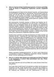 3 2. Gibt es in Sachsen-Anhalt Ausbildungsprogramme, mit denen gezielt Mig- ranten für Berufe im Pflegebereich angeworben und/oder ausgebildet werden? Die Bundesagentur für Arbeit mit ihrer Zentralen Auslands- und Fachvermittlung und die Deutsche Gesellschaft für Internationale Zusammenarbeit GmbH be- mühen sich seit dem Jahr 2013 verstärkt um die Gewinnung ausländischer Fachkräfte, um den aktuellen und künftigen Fachkräfteengpässen in Gesund- heits- und Pflegeberufen gezielt entgegen zu wirken. Im Rahmen des Projektes Triple Win werden Pflegekräfte aus dem Ausland gewonnen, qualifiziert und bei ihrer Integration am Arbeitsplatz begleitet. Alle teilnehmenden Fachkräfte erwerben im Rahmen des Projektes das B1- Deutschzertifikat und sind pflegefachlich auf ihren Einsatz in Deutschland vor- bereitet. Auch die Arbeitgeber werden bei der Integration der ausländischen Fachkräfte begleitet. Außerdem koordiniert das Projekt das Verfahren für die Anerkennung der ausländischen Qualifikationen. Das Projekt basiert auf bilate- ralen Vermittlungsabsprachen zwischen der Bundesagentur für Arbeit und den teilnehmenden Herkunftsländern (Bosnien, Serbien, Philippinen und Tunesien). Das Projekt Triple Win wird bundesweit umgesetzt. In Sachsen-Anhalt konnten bislang keine ausländischen Pflegekräfte angeworben werden. Darüber hinaus unterstützt und fördert das Ministerium für Arbeit, Soziales und Integration seit dem 1. November 2017 das Projekt „Beruf schafft Zukunft“. Ziel des an den Standorten Halle und Magdeburg durch den Projektträger AWO SPI GmbH umgesetzten Projektes ist die Orientierung und Vorbereitung von Mig- rantinnen und Migranten auf eine Ausbildungsaufnahme, vornehmlich im Be- reich Pflege. Das Projekt ist konzipiert als einjährige Orientierungs- und Vor- schaltmaßnahme zur Vorbereitung auf die Aufnahme einer Ausbildung im je- weils folgenden Jahr. Es umfasst berufsorientierende Maßnahmen einschließ- lich berufsvorbereitender Praktika sowie Sprachförderung bzw. Intensiv- Deutschkurse. Voraussetzung für eine Teilnahme am Projekt sind neben dem bekundeten Interesse an einer Ausbildung im Bereich Pflege Sprachkenntnisse auf dem Sprachniveau A2 und ein Hauptschulabschluss oder ein als gleichwer- tig anerkannter Schulabschluss. Weitere spezifische Ausbildungsprogramme, mit denen gezielt Migrantinnen und Migranten für Berufe im Pflegebereich angeworben und/oder ausgebildet werden, sind der Landesregierung nicht bekannt. 3. Wenn ja, in welcher Höhe förderte die Landesregierung dieses Programm in den vergangenen 10 Jahren? Bitte aufschlüsseln nach Jahr, Förder- summe, Projektname. Das Projekt Triple Win wird nicht aus Mitteln des Landes Sachsen-Anhalt finan- ziell gefördert. Das Projekt „Beruf schafft Zukunft“ wird gefördert aus Mitteln des Europäischen Sozialfonds und des Landes Sachsen-Anhalt. Die Laufzeit des Projektes er- streckt sich vom 1. November 2017 bis voraussichtlich 31. Oktober 2020. Für die Förderung des Vorhabens wird eine Gesamtsumme in Höhe von