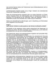 3 denn seit dem Sommer stehen den Förderschulen keine Zivildienstleistenden mehr er- gänzend zur Verfügung. Lerntherapeutische Angebote werden, wie zu Frage 1 erläutert, vom unterstützenden Personal der Förderschulen unterbreitet. Neben den lerntherapeutischen Angeboten gibt es an einigen Standorten von Förder- schulen integrative Horte, die Ferienangebote durch ihr Hortpersonal vorhalten. In Naumburg und Wernigerode ist die Lebenshilfe Träger des integrativen Hortes, in Weißenfels und Zeitz ist es INTEGRA und in Halle ist es ein Förderverein. Seitens der Lebenshilfe gibt es Bemühungen, auch in Quedlinburg und Wolmirsleben einen integrativen Hort einzurichten. Frage 3: Nach welchen Verfahren wurden jeweils an den Schulen die Bedarfe ermittelt? Die Bedarfe an den integrativen Horten werden entsprechend den Regelungen zur Hortbetreuung erfasst. Die Eltern beantragen eine Hortbetreuung zu den bekannten Anmeldeterminen und nach den Anmeldemodalitäten. Die Förderschulen planen die lerntherapeutischen Angebote nach personellen Mög- lichkeiten und sonderpädagogischem Bedarf. Für die personelle Planung stehen die Arbeitszeiten des unterstützenden Personals der Förderschule in unterrichtsfreier Zeit zur Verfügung. Der Erlass zur Arbeitszeit des unterstützenden Personals sieht bei Vollzeitkräften sechs Arbeitstage in unter- richtsfreier Zeit vor. Bei Beschäftigten in Teilzeitverträgen ist die Anzahl der Ar- beitstage in unterrichtsfreier Zeit entsprechend geringer. Drei dieser Arbeitstage sind an die Vorbereitungstage vor Schuljahresbeginn gebunden, so dass in der Regel drei Arbeitstage je Beschäftigter/m in Vollzeitbeschäftigung für lerntherapeutische Ange- bote genutzt werden können. Von individuellen Teilzeitverträgen machen immer mehr Beschäftigte Gebrauch, da sie altersbedingt die hohe physische und psychi- sche Belastung damit kompensieren. Entsprechend der Schulgröße, der Schülerzahl, des Schulstandortes und des Umfangs der Beschäftigten in Vollzeit sind die Möglich- keiten der Schulen demzufolge unterschiedlich. Die Schulen erarbeiten ihre lerntherapeutischen Angebote vor Schuljahresbeginn, unterbreiten diese den Eltern und erwarten einen terminierten Rücklauf, so dass dann die Jahresarbeitszeit des unterstützenden Personals geplant werden kann. Bei eingerichteten lerntherapeutischen Angeboten kann die Schule punktuell späte- ren Bedarfen noch entsprechen (ein/zwei Kinder mehr sind zu verkraften, mitunter melden sich auch angemeldete Kinder ab, so dass ein Austausch möglich ist). Schwieriger ist die Situation bei krankheitsbedingtem Ausfall des unterstützenden Personals.