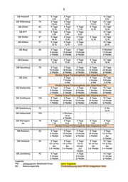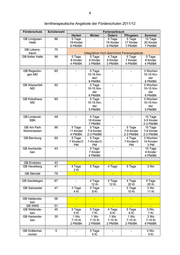 4 lerntherapeutische Angebote der Förderschulen 2011/12 Förderschule Schülerzahl Ferienzeitraum Herbst Winter Ostern Pfingsten Sommer GB Lindgreen 86 5 Tage - 5 Tage 5 Tage 15 Tage Halle 18 Kinder 19 Kinder 17 Kinder 20 Kinder 6 PM/BK 6 PM/BK 7 PM/BK 7 PM/BK GB Lebens- 75 baum Integrativer Hort übernimmt Ferienangebote GB Keller Halle 98 5 Tage 5 Tage 4 Tage 5 Tage 5 Tage 8 Kinder 8 Kinder 6 Kinder 7 Kinder 8 Kinder 4 PM/BK 3 PM/BK 3 PM/BK 4 PM/BK 4 PM/BK GB Regenbo- 85 - 5 Tage - - 3 Wochen gen MD 10-15 Kin- 10-15 Kin- der/ der 8 PM/BK 8 PM/BK GB Wasserfall 92 - 5 Tage - - 3 Wochen MD 10-15 Kin- 10-15 Kin- der der 6 PM/BK 6 PM/BK GB Kükelhaus 85 - 5 Tage - - 3 Wochen MD 10-15 Kin- 10-15 Kin- der der 5 PM/BK 5 PM/BK GB Lindenstr. 49 - 5 Tage - - 15 Tage SBK 18 Kinder 3-5 Kinder 7 PM/BK 2-3 PM/BK GB Am Park 99 5 Tage 5 Tage - 5 Tage 15 Tage Wolmirsleben 11 Kinder 7-9 Kinder 7-9 Kinder 7-9 Kinder 4 PM/BK 2-3 PM/BK 2-3 PM/BK 2-3 PM/BK GB Bernburg 69 5 Tage 5 Tage - 4 Tage 3 Wochen 7 Kinder/3 7 Kinder/3 7 Kinder/3 10 Kinder/ PM PM PM 3 PM GB Aschersle- 43 - 5 Tage - - 15 Tage ben 7 Kinder 9 Kinder 4 PM/BK 4 PM/BK GB Erxleben 43 - - - - - GB Havelberg 41 5 Tage 5 Tage 4 Tage 5 Tage 3 Wo 2 Ki GB Stendal 76 - - - - - GB Gardelegen 67 - 4 Tage 4 Tage 4 Tage 5 Tage 12 Ki 12 Ki 20 Ki 20 Ki GB Salzwedel 47 3 Tage 5 Tage - 5 Tage 3 Wo 4 Ki 8 Ki 10 Ki 11 Ki GB Haldensle- 58 - - - - - ben GB WMS 51 - - - - - GB Wefensle- 45 5 Tage 5 Tage 4 Tage 5 Tage 3 Wo. ben 5 Ki 7 Ki 8 Ki 6 Ki 7 Ki GB Hamersle- 35 1 Wo 1 Wo 1 Wo 1 Wo 3 Wo ben 7-10 Ki 7-10 Ki 7-10 Ki 7-10 Ki 7-10 Ki 2 PM/BK 2 PM/BK 2 PM/BK 2 PM/BK 6 PM/BK GB Gräfenhai- 5 - 5 Tage - - 3 Wo. nichen 5 Ki 5 Ki