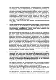 3 gen den Aussagen des städtebaulichen Vertrages zwischen Vorhabenträger und Kommune, nicht nur auf die Änderung des Flächennutzungsplanes be- schränkt. Vielmehr ist auch durch die Aufstellung eines aus dem geänderten Flächennutzungsplanes entwickelten Bebauungsplanes Baurecht zu schaffen. Daraufhin teilte die UNB dem Vorhabenträger am 1. Juni 2012 telefonisch mit, dass die Arbeiten einzustellen sind. Mit Schreiben vom 4. Juni 2012 teilte die UNB der Fa. G. Papenburg AG noch einmal schriftlich mit, dass die o. g. Ein- griffsgenehmigung nicht ausreicht, bauliche Handlungen durchzuführen. Es wurde auf die notwendigen planungsrechtlichen Voraussetzungen und ggf. wei- tere andere Genehmigungen verwiesen. Nach dem 1. Juni 2012 wurden keine weiteren Geländeregulierungsarbeiten durchgeführt. 4. Wurde im Rahmen der Beratungen zur Änderung des Flächennutzungs- planes geprüft, ob die von der Firma G. Papenburg AG geplanten Anlagen zur Baustoffaufbereitung auch auf bereits vorhandenen als Gewerbe- und Industriegebiete ausgewiesenen Flächen in der nahen Umgebung (Ge- markung Colbitz) errichtet werden können? Die Verbandsgemeinde Elbe-Heide teilt mit, dass im Rahmen der Untersuchun- gen geprüft wurde, ob auch andere bereits als Gewerbebauland festgesetzte Standorte in Colbitz in Frage kommen. Dies war zu verneinen. In der Begrün- dung wurde sachgerecht und hinreichend nachgewiesen, dass die geplante gewerbliche Nutzung aufgrund intensiver Verflechtungen und von Stoffströmen mit dem Gewinnungs- und gegebenenfalls Deponierungseinrichtungen am Standort durch Bandförderanlagen eng verbunden sind. Die unmittelbare Ver- bindung mit dem Abbau- bzw. Deponiebereich trägt zur Verkehrsvermeidung im Sinne des Grundsatzes der Raumordnung G 5.9.1.2 des Regionalen Entwick- lungsplans 2006 für die Planungsregion Magdeburg bei, in dem Rohstoffe auf- kommensnah verarbeitet werden und die Verkehre zum Standort gebündelt werden können. Die betrieblichen Anlagen können somit nicht an anderer Stelle errichtet oder betrieben werden. Dies wäre weder umsetzbar noch mit den Zie- len der Vermeidung unnötiger Verkehre vereinbar. 5. Die Firma G. Papenburg AG betreibt eine Anlage zum Sandabbau auf dem Gebiet der Stadt Wolmirstedt. Wie beurteilt die Landesregierung die Not- wendigkeit der gemeinsamen Entwicklung der Flächennutzungspläne der Stadt Wolmirstedt und der angrenzenden Verbandsgemeinde Elbe-Heide vor dem Hintergrund einer geordneten Raumordnung und Landesentwick- lung und zur Vermeidung einer Konkurrenzsituation bei der Flächennut- zungsplanung der beiden angrenzenden Gemeinden? Die Ziele und Grundsätze der Raumordnung für das Land Sachsen-Anhalt sind im Landesentwicklungsplan 2010 festgelegt und im Regionalen Entwicklungs- plan für die Planungsregion Magdeburg konkretisiert und ergänzt. Entsprechend der landesplanerischen Stellungnahmen vom 12. Oktober 2012 und 3. Januar 2013 zur 3. Änderung des Flächennutzungsplanes der Gemein- de Colbitz ist diese mit den Erfordernissen der Raumordnung vereinbar. Das BauGB kennt verschiedene Arten der zwischengemeindlichen Zusam- menarbeit in der Bauleitplanung, insbesondere das interkommunale Abstim-