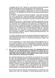 4 mungsgebot des § 2 Abs. 2 BauGB, den gemeinsamen Flächennutzungsplan gemäß § 204 BauGB und den Planungsverband nach § 205 BauGB. Die drei im BauGB verankerten Möglichkeiten der interkommunalen Zusam- menarbeit bei der Bauleitplanung unterscheiden sich durch ihre Intensität und damit auch in der Dringlichkeit der Gründe, die eine Zusammenarbeit erforder- lich machen. § 204 BauGB - Gemeinsamer Flächennutzungsplan - regelt dabei die Aufstel- lung eines gemeinsamen Flächennutzungsplans benachbarter Gemeinden bzw. die Vereinbarung der Gemeinden über bestimmte Darstellungen in ihren Flächennutzungsplänen als gemeinsame Planung für räumliche oder sachliche Teilbereiche. Entsprechend § 204 Abs. 1 BauGB sollen benachbarte Gemeinden einen ge- meinsamen Flächennutzungsplan aufstellen, wenn ihre städtebauliche Entwick- lung wesentlich durch gemeinsame Voraussetzungen und Bedürfnisse be- stimmt wird oder so ein gerechter Ausgleich der verschiedenen Belange ermög- licht wird. Die hier gemeinten gemeinsamen Voraussetzungen und Bedürfnisse beziehen sich im weiteren Sinn auf Infrastruktureinrichtungen und –netze der Daseinsvorsorge, die nicht mehr von jeder einzelnen Gemeinde vorgehalten werden können. Der Ausgleich der verschiedenen Belange soll insbesondere dem notwendigen Ausgleich zwischen Siedlungsentwicklungsinteressen und Naturschutzinteressen dienen. Vor diesem Hintergrund wird eine gemeinsame Flächennutzungsplanung der Verbandsgemeinde Elbe-Heide und der Stadt Wolmirstedt nur aufgrund der in beiden Gemeinden durch die Fa. G. Papenburg AG betriebenen Anlagen nicht für notwendig erachtet. Es wird diesbezüglich auf das interkommunale Abstimmungsgebot des § 2 Abs. 2 BauGB verwiesen, wonach die Bauleitpläne benachbarter Gemeinden aufeinander abzustimmen sind. Das materielle Abstimmungsgebot stellt einen Unterfall des Abwägungsgebotes des § 1 Abs. 7 BauGB dar, so dass die hier- für entwickelten Grundsätze anzuwenden sind. 6. Wie schätzt die Landesregierung den mittel- und langfristigen Bedarf an Deponien im Land Sachsen-Anhalt ein? Besteht nach Ansicht der Lan- desregierung die Notwendigkeit, weitere Deponien zu errichten? Wenn ja, liegen dafür bereits Anträge vor? Bitte geplante Fläche, Standort und ge- planter Zeitpunkt der Inbetriebnahme angeben. Das zuständige Ministerium für Landwirtschaft und Umwelt teilt hierzu mit, dass der mittel- und langfristige Bedarf an Entsorgungskapazitäten zur Gewährleis- tung der Entsorgungssicherheit im Land Sachsen-Anhalt umfassend im Abfall- wirtschaftsplan (AWP) für das Land Sachsen-Anhalt 2011 dargestellt und durch entsprechende Prognosen zur Aufkommensentwicklung unter Beachtung der aktuellen rechtlichen und wirtschaftlichen Rahmenbedingungen untersetzt ist. Im Ergebnis wird festgestellt, dass im Planungszeitraum die Entsorgungs- sicherheit für die im Land Sachsen-Anhalt anfallenden, den ÖRE überlassenen Siedlungsabfälle und erzeugten gefährlichen Abfälle gewährleistet ist. Diese Prognose des AWP stellt kein Ausschlusskriterium zur Errichtung neuer Deponien dar, sofern der Antragsteller im Genehmigungsverfahren einen ent-
