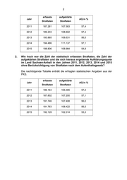 2 erfasste aufgeklärte Jahr AQ in % Straftaten Straftaten 2011 187.281 107.583 57,4 2012 189.233 108.602 57,4 2013 193.885 109.531 56,5 2014 194.486 111.137 57,1 2015 198.806 108.984 54,8 2. Wie hoch war die Zahl der statistisch erfassten Straftaten, die Zahl der aufgeklärten Straftaten und die sich hieraus ergebende Aufklärungsquote im Land Sachsen-Anhalt in den Jahren 2011, 2012, 2013, 2014 und 2015 ohne Berücksichtigung von Straftaten nach dem Aufenthaltsgesetz? Die nachfolgende Tabelle enthält die erfragten statistischen Angaben aus der PKS. erfasste aufgeklärte Jahr AQ in % Straftaten Straftaten 2011 186.164 106.485 57,2 2012 187.802 107.200 57,1 2013 191.746 107.408 56,0 2014 191.763 108.422 56,5 2015 192.128 102.314 53,3