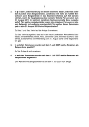2 2. In § 54 der Landkreisordnung ist derzeit bestimmt, dass Landkreise außer dem Landrat einen Beigeordneten, Landkreise mit mehr als 120000 Ein- wohnern zwei Beigeordnete in das Beamtenverhältnis auf Zeit berufen können, wenn die Hauptsatzung dies vorsieht. Welche Person nahm zum 31. August 2013 in welchem Landkreis Sachsen-Anhalts diese Aufgabe wahr? Für welche Aufgabenfelder waren die einzelnen Personen zu die- sem Zeitpunkt im Landkreis verantwortlich? In welcher dieser Gemeinden gab es zum 31. August 2013 keine Beigeordneten? Zu Satz 2 und Satz 3 wird auf die Anlage 3 verwiesen. Zu Satz 4 wird ausgeführt, dass es in den neun Landkreisen Altmarkkreis Salz- wedel, Anhalt-Bitterfeld, Börde, Harz, Jerichower Land, Mansfeld-Südharz, Saa- lekreis, Salzlandkreis und Wittenberg zum 31. August 2013 keine Beigeordne- ten gab. 3. In welchen Kommunen wurden seit dem 1. Juli 2007 welche Personen als Beigeordnete gewählt? Auf die Anlage 4 wird verwiesen. 4. In welchen Kommunen wurden seit dem 1. Juli 2007 welche Personen als Beigeordnete abgewählt? Eine Abwahl eines Beigeordneten ist seit dem 1. Juli 2007 nicht erfolgt.