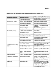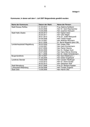 6 Anlage 4 Kommunen, in denen seit dem 1. Juli 2007 Beigeordnete gewählt wurden: Name der Kommune: Datum der Wahl: Name der Person: Stadt Dessau-Roßlau 01.02.2012 Frau Sabrina Nußbeck 23.04.2008 Herr Dr. Gerd Raschpichler 10.09.2008 Herr Joachim Hantusch Stadt Halle (Saale) 26.09.2012 Herr Egbert Geier 25.05.2011 Herr Uwe Stäglin 30.01.2013 Frau Dr. Judith Marquardt 24.09.2008 Herr Tobias Kogge 24.10.2007 Herr Wolfram Neumann 30.01.2008 Dr. Bernd Wiegand (jetzt OB) Landeshauptstadt Magdeburg 26.02.2009 Herr Holger Platz 12.04.2007 Herr Kaus Zimmermann 03.07.2009 Herr Rainer Nitsche 26.02.2009 Herr Dr. Rüdiger Koch 03.07.2008 Herr Hans-Werner Brüning 06.11.2008 Herr Dr. Dieter Scheidemann Burgenlandkreis 29.10.2007 Herr Gerd Waldmann + 31.08.2009 Herr Dieter Engelhardt Landkreis Stendal 19.06.2008 Herr Carsten Wulfänger 14.03.2013 Herr Dr. Denis Gruber 30.05.2013 Herr Sebastian Stoll Stadt Merseburg 03.07.2008 Frau Dr. Barbara Kaaden Lutherstadt Wittenberg 24.09.2008 Herr Torsten Zugehör Stadt Zeitz 13.08.2009 Herr Henrik Otto