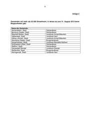 4 Anlage 2 Gemeinden mit mehr als 25 000 Einwohnern, in denen es zum 31. August 2013 keine Beigeordneten gab: Name der Gemeinde: Aschersleben, Stadt Salzlandkreis Bernburg (Saale), Stadt Salzlandkreis Bitterfeld-Wolfen, Stadt Landkreis Anhalt-Bitterfeld Halberstadt, Stadt Landkreis Harz Köthen (Anhalt), Stadt Landkreis Anhalt-Bitterfeld Naumburg (Saale), Stadt Burgenlandkreis Sangerhausen, Stadt Landkreis Mansfeld-Südharz Schönebeck (Elbe), Stadt Salzlandkreis Staßfurt, Stadt Salzlandkreis Hansestadt Stendal Landkreis Stendal Weißenfels, Stadt Burgenlandkreis Wernigerode, Stadt Landkreis Harz